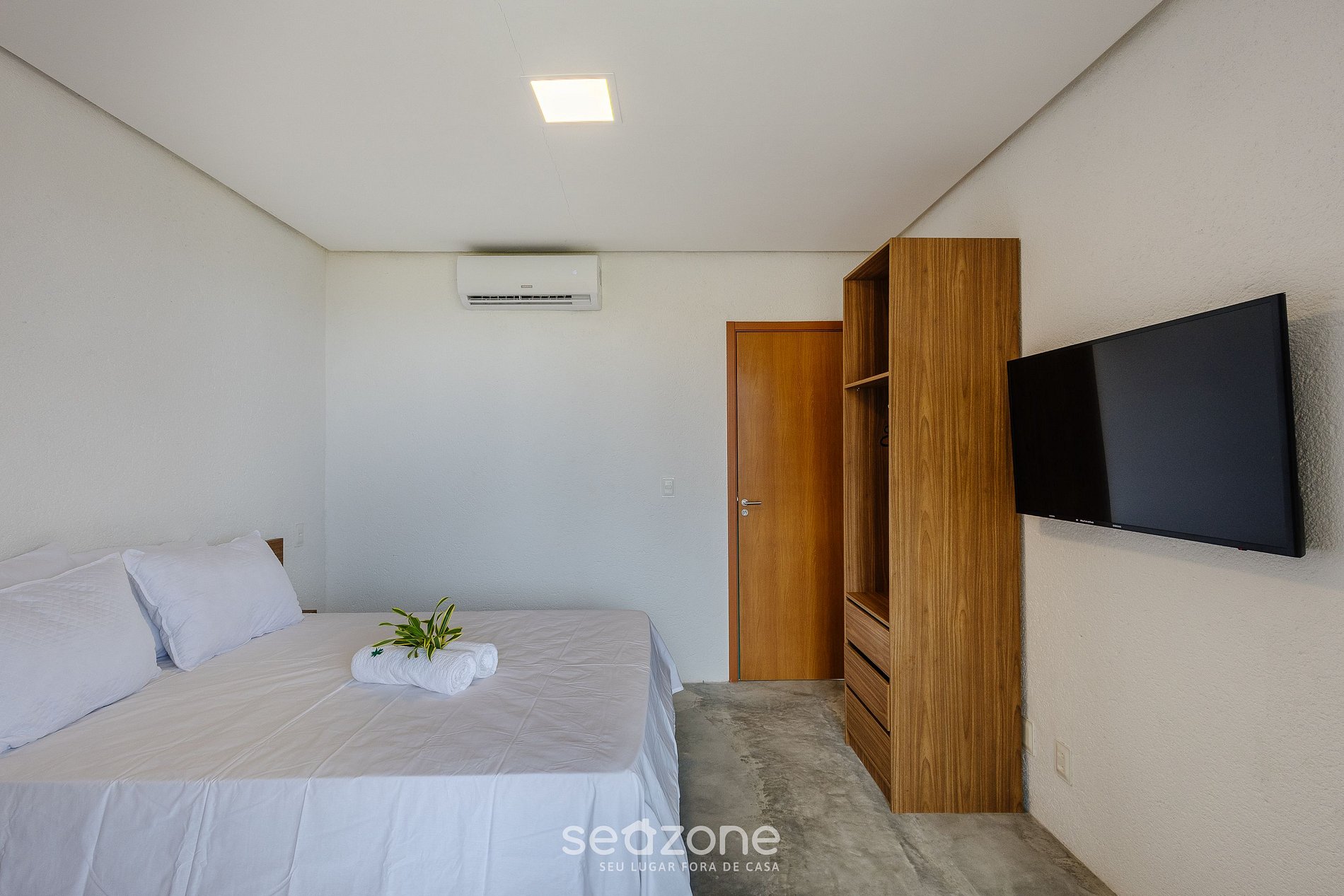 - 1 Suíte com Cama de casal, Cama auxiliar de solteiro, Smart TV, arara para roupas, varanda com rede de descanso, cortina com black-out e ar-condicionado;