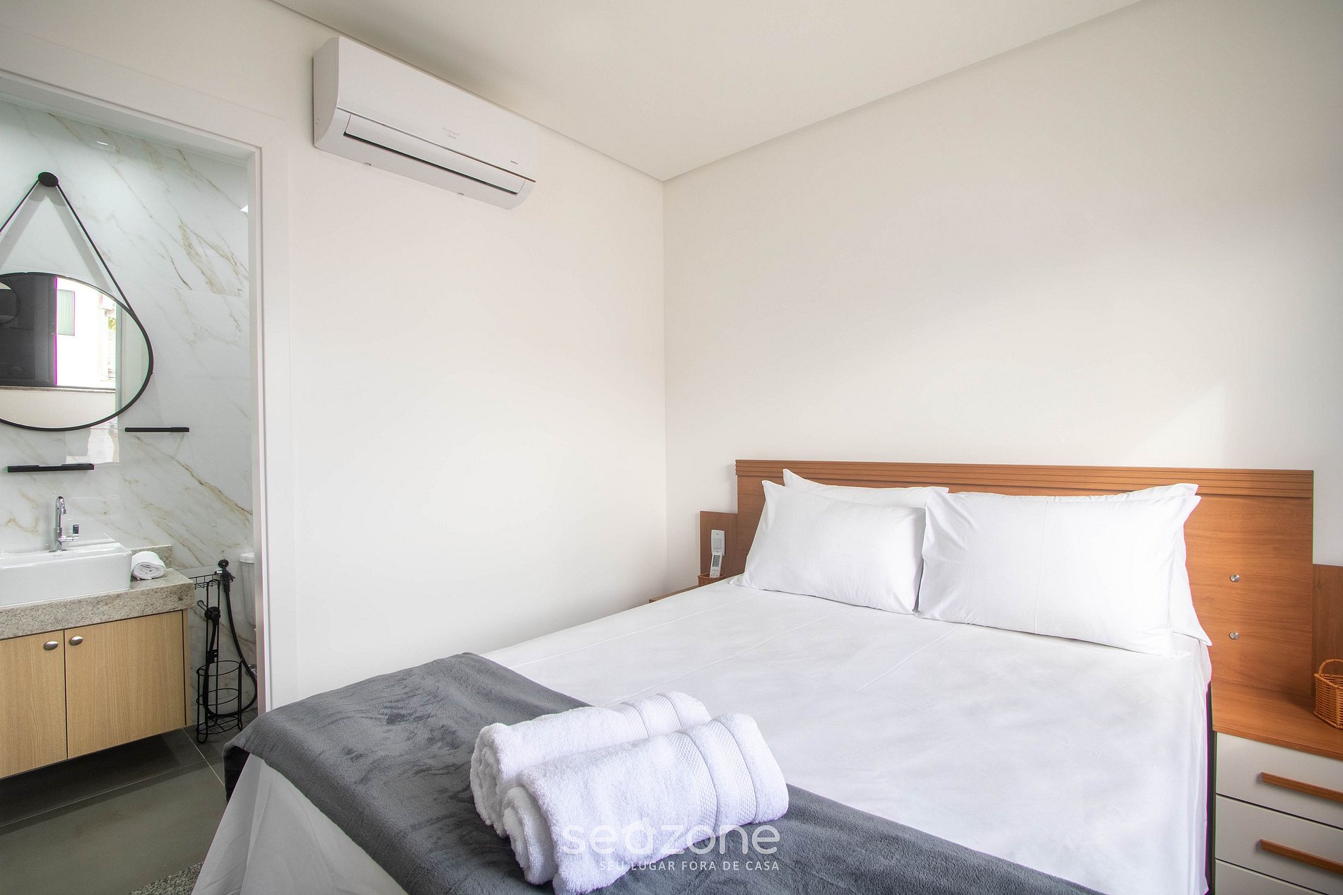 - 1 suíte com cama de casal, armário e ar-condicionado;