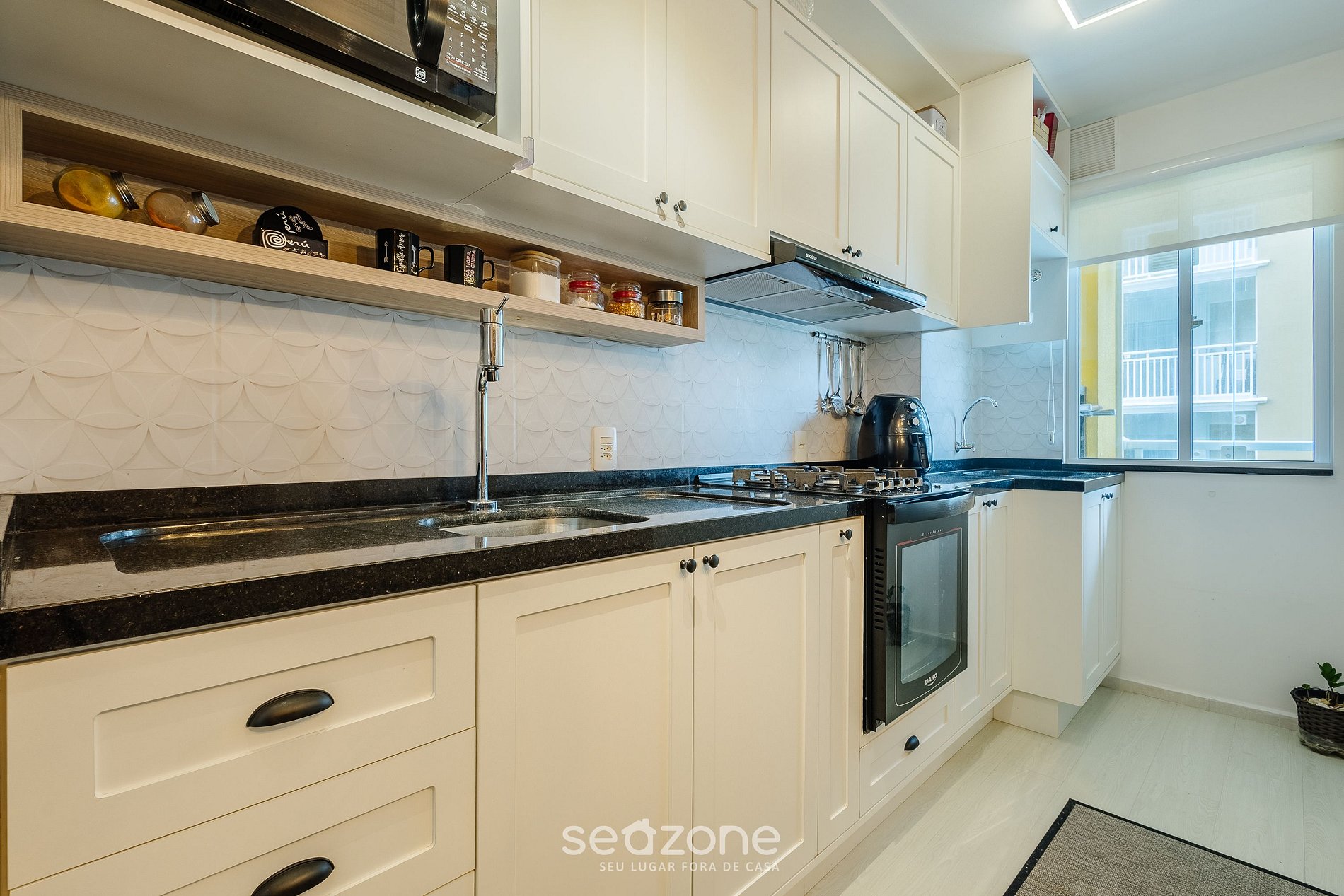 - Cozinha completa com geladeira, fogão e forno a gás, airfryer, micro-ondas, sanduicheira, Kit café (suporte para filtro, garrafa térmica), chaleira, liquidificador, taças de vinho, panelas, louças e utensílios;