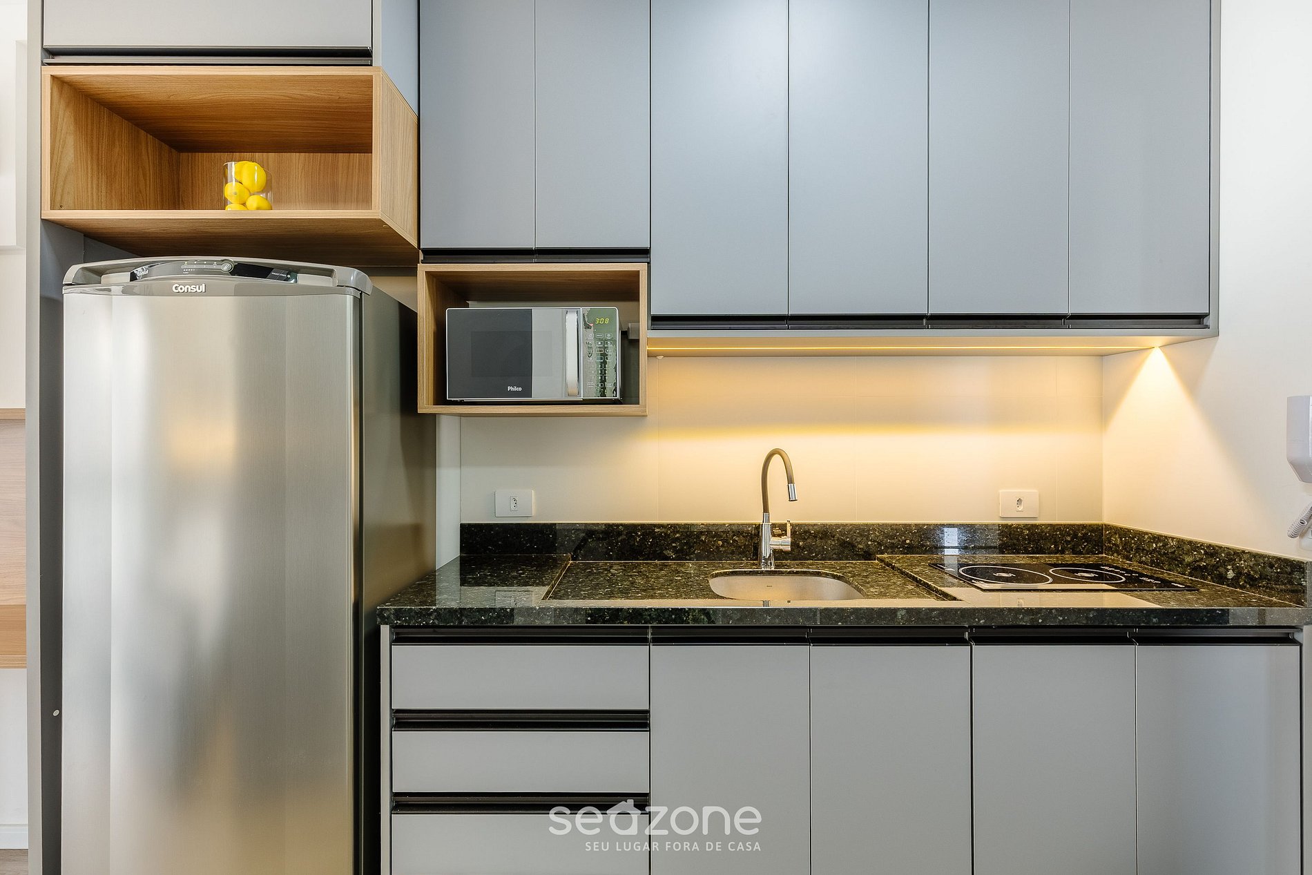 - Cozinha completa com geladeira, fogão cooktop (indução), micro-ondas, sanduicheira, cafeteira elétrica, chaleira elétrica, liquidificador, taças de vinho, panelas, louças e utensílios;