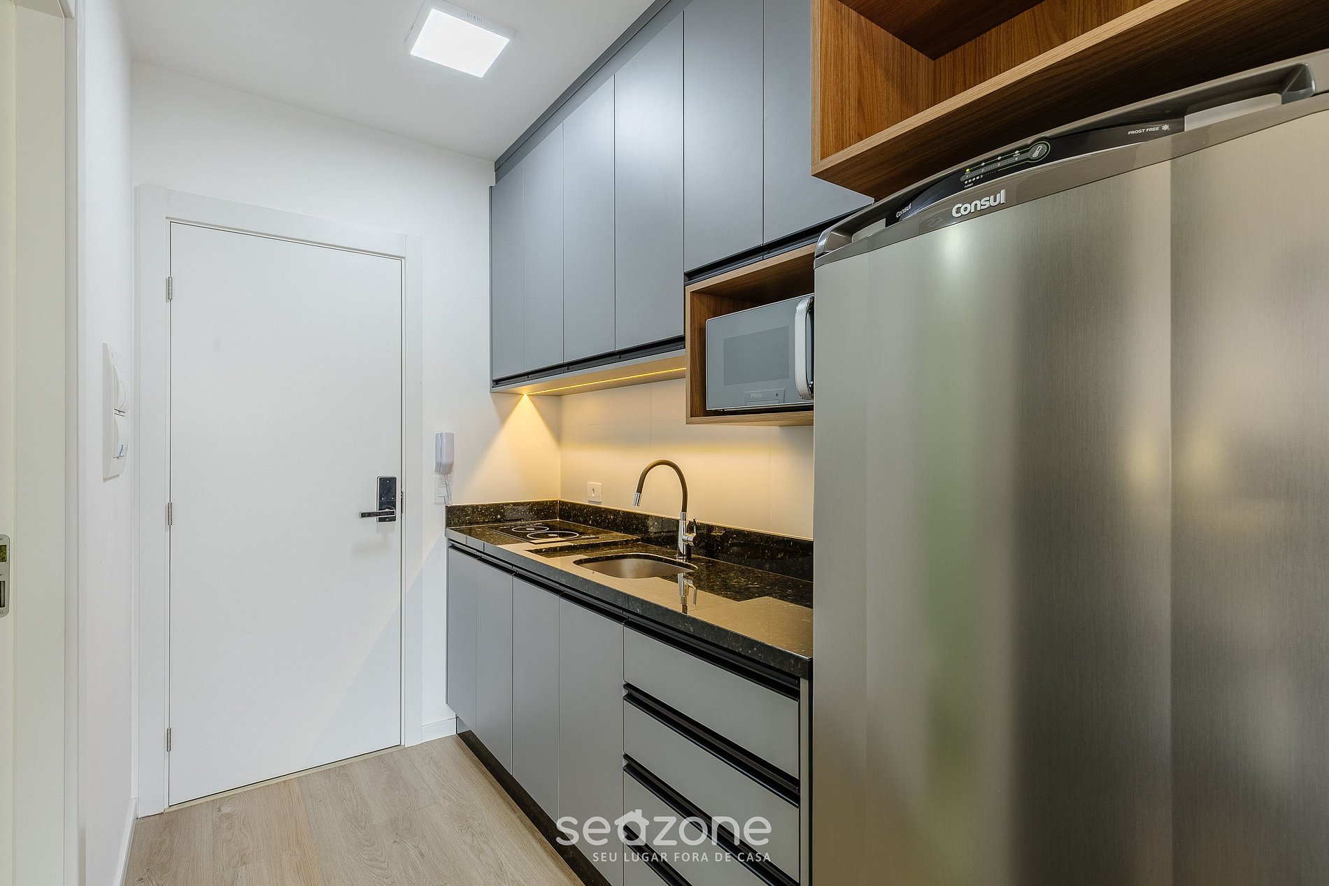 - Cozinha completa com geladeira, fogão cooktop (indução), micro-ondas, sanduicheira, cafeteira elétrica, chaleira elétrica, liquidificador, taças de vinho, panelas, louças e utensílios;