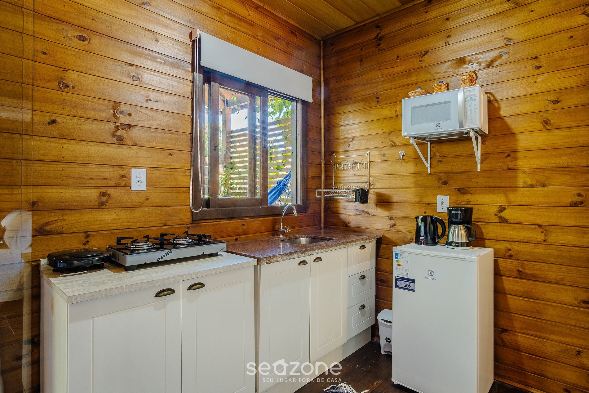 - Cozinha completa com frigobar, fogão cooktop (gás), micro-ondas, sanduicheira, cafeteira elétrica, chaleira elétrica, liquidificador, taças de vinho, panelas, louças e utensílios;