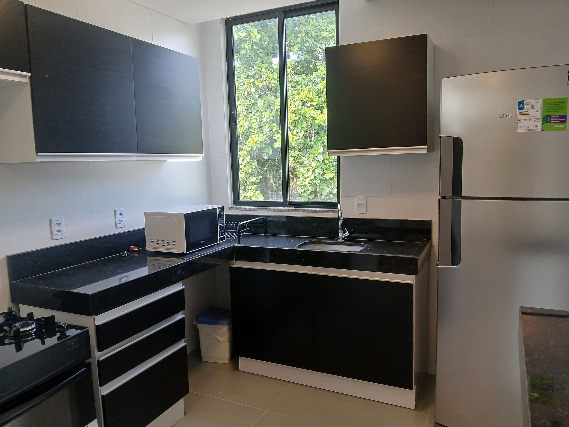 - Cozinha completa com geladeira, fogão e forno à gás, microondas, sanduicheira, cafeteira elétrica, chaleira comum, liquidificador, taças de vinho, panelas, louças e utensílios;