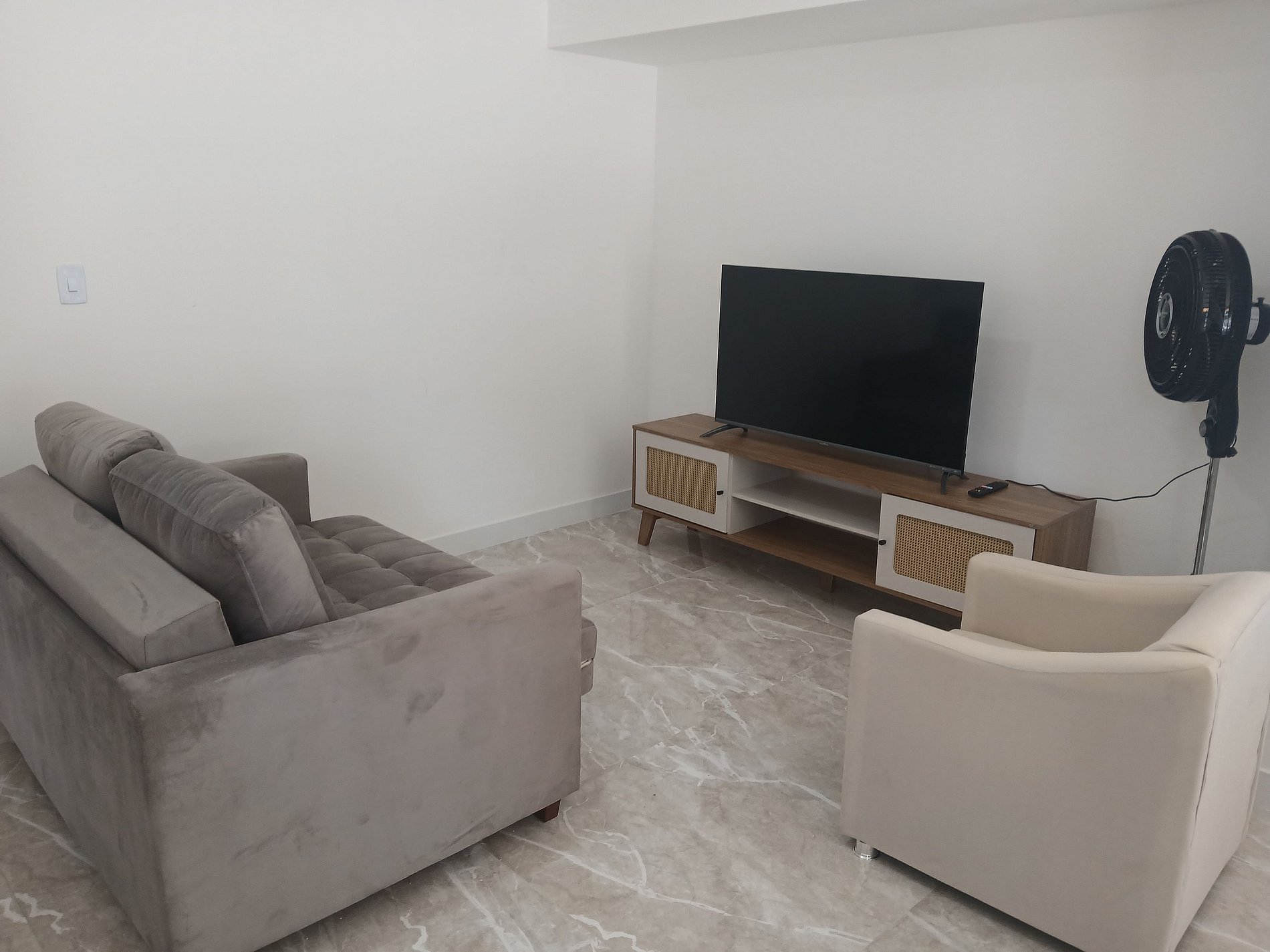 - Sala com sofá-cama de solteiro, Smart TV e ventilador portátil;