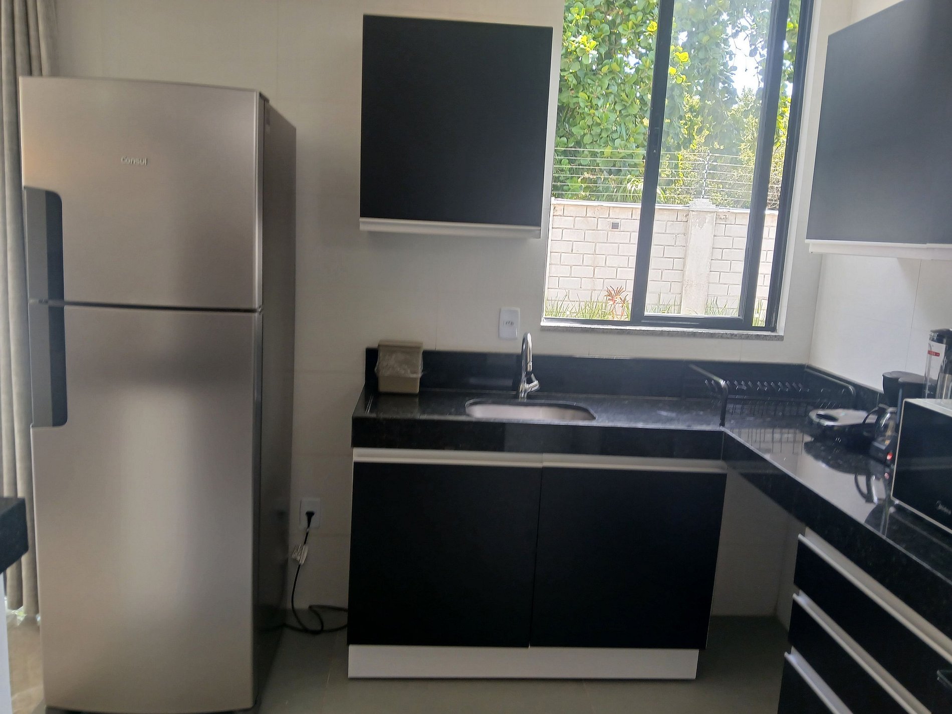 - Cozinha completa com geladeira, fogão e forno à gás, microondas, sanduicheira, cafeteira elétrica, chaleira comum, liquidificador, taças de vinho, panelas, louças e utensílios;