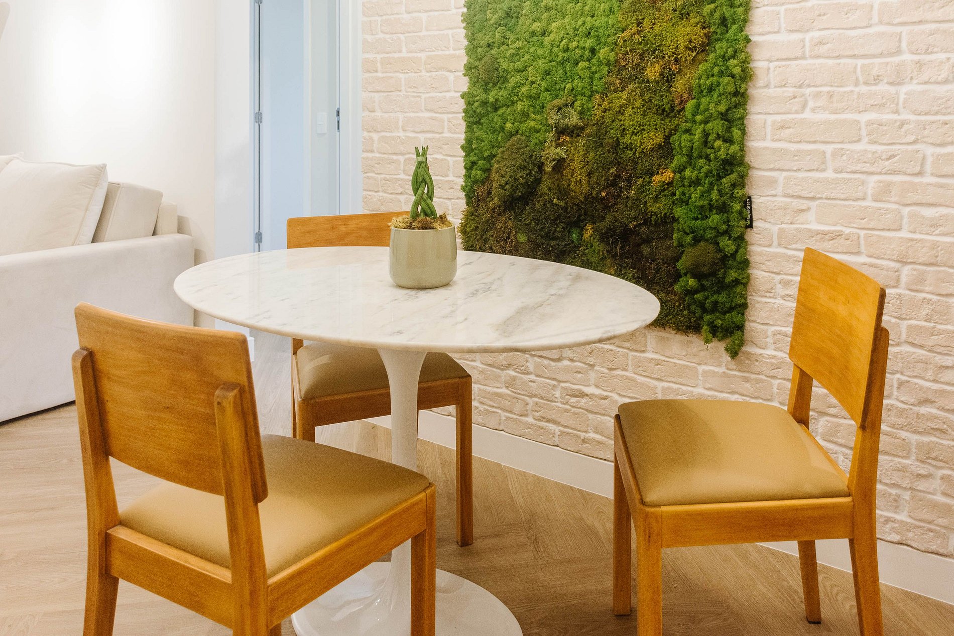 - Sala de estar integrada a sala de jantar, com sofá, TV, mesa e 3 cadeiras;