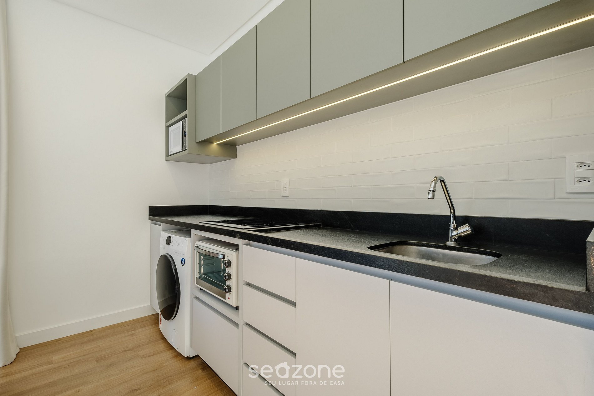 - Cozinha completa com geladeira, fogão cooktop (indução), forno elétrico, micro-ondas, sanduicheira, cafeteira elétrica, chaleira elétrica, liquidificador, taças de vinho, panelas, louças e utensílios;