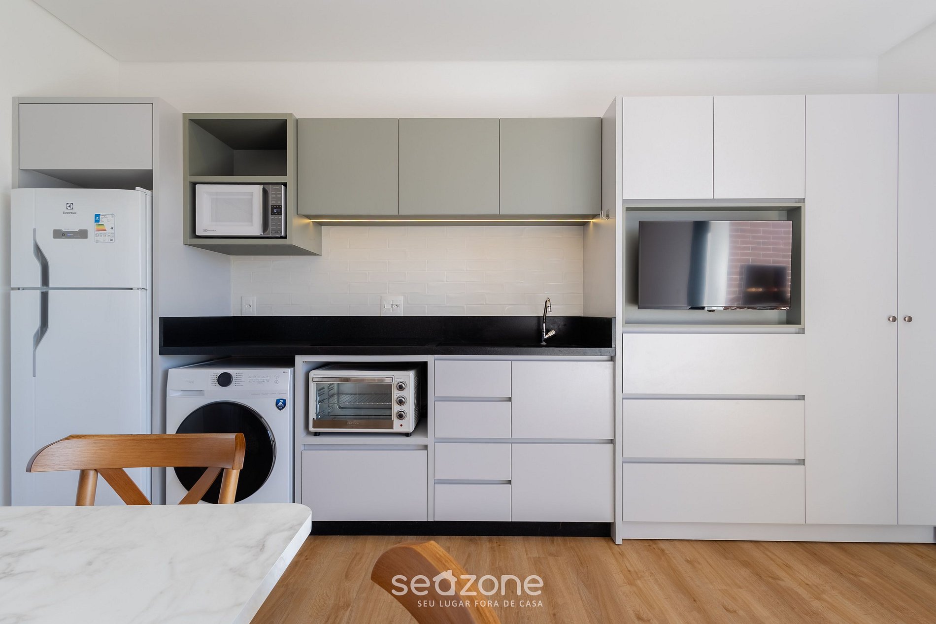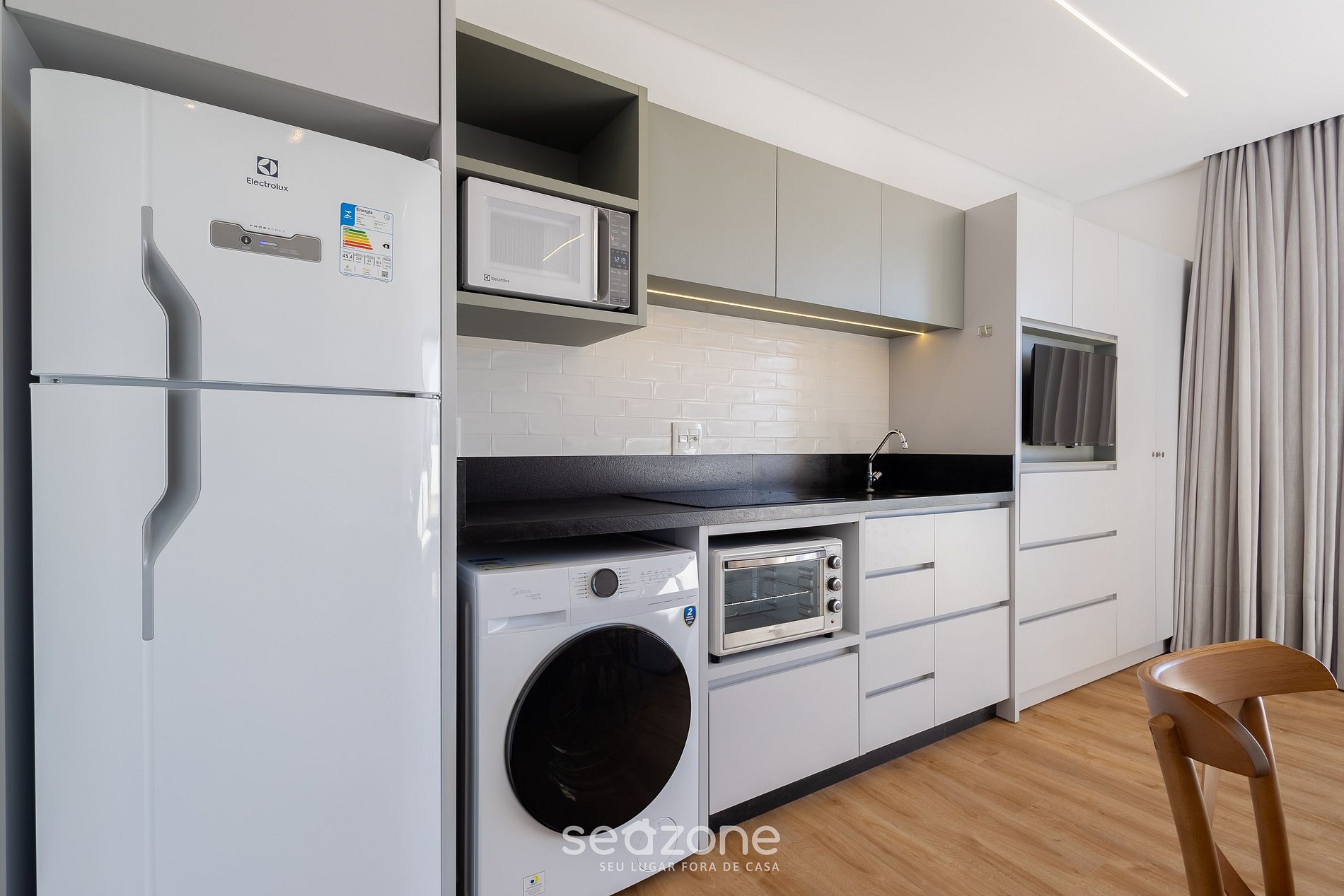 - Cozinha com geladeira, fogão cooktop (indução), forno elétrico, micro-ondas, sanduicheira, cafeteira elétrica, chaleira elétrica, liquidificador, taças de vinho, panelas, louças e utensílios;