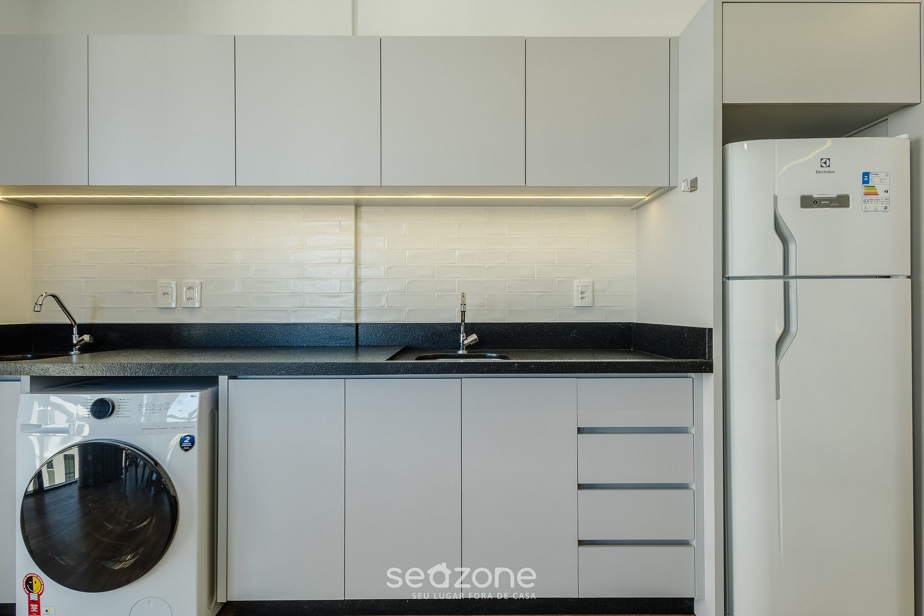 - Cozinha completa com geladeira, fogão cooktop (indução), forno elétrico, micro-ondas, sanduicheira, cafeteira elétrica, chaleira elétrica, liquidificador, taças de vinho, panelas, louças e utensílios;