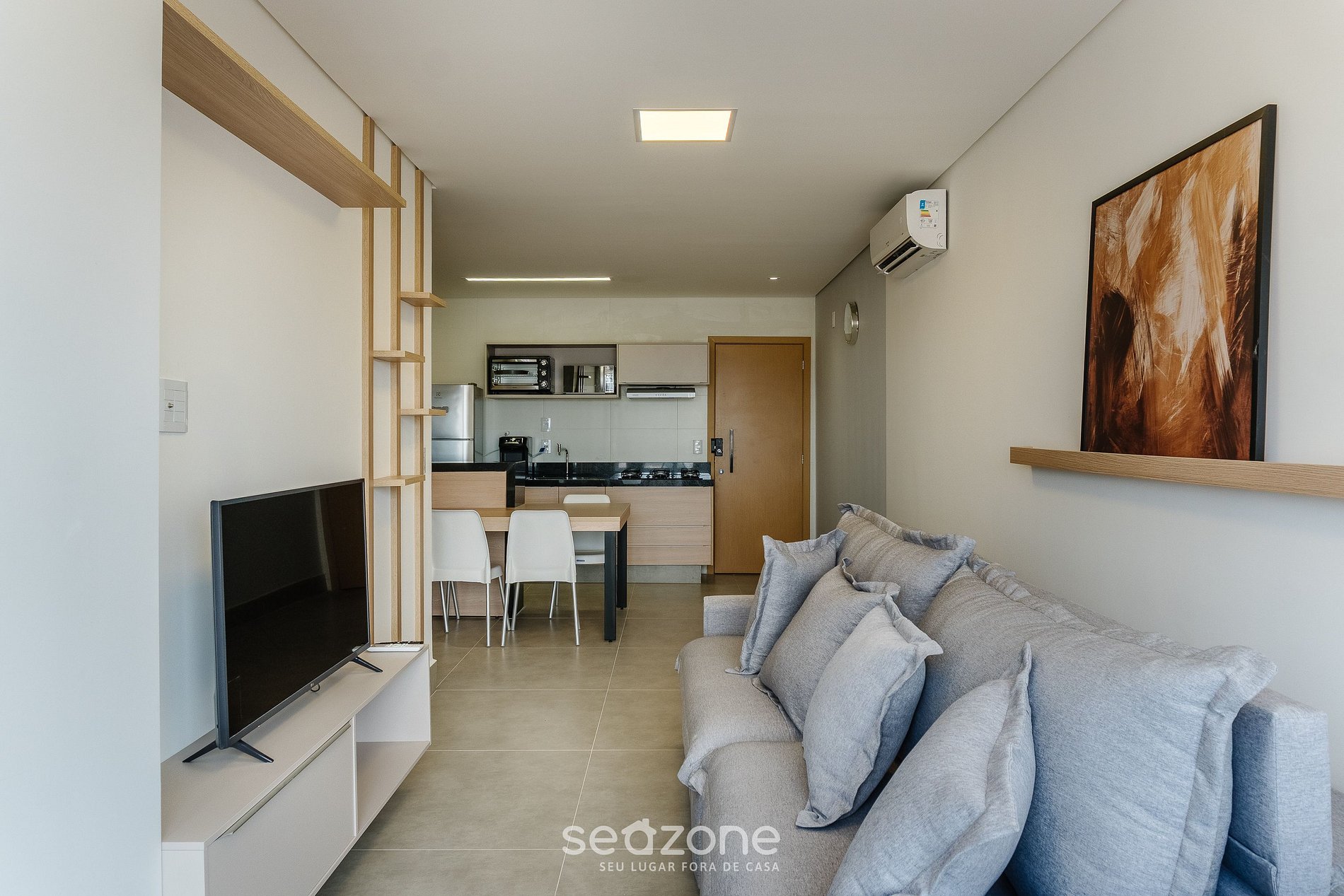 - Sala de estar com Sofá, espaço para notebook, ar-condicionado e Smart TV;