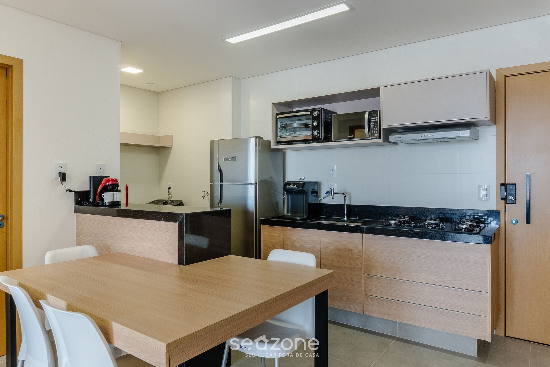 - Cozinha completa com geladeira, fogão cooktop (gás), forno elétrico, micro-ondas, sanduicheira, cafeteira elétrica, liquidificador, taças de vinho, panelas, louças e utensílios;