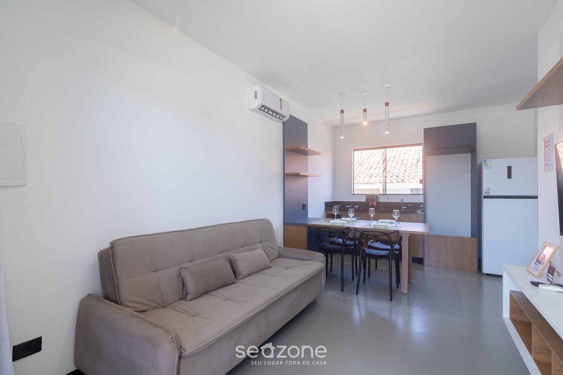 - Sala com com sofá, Smart TV e ar-condicionado;