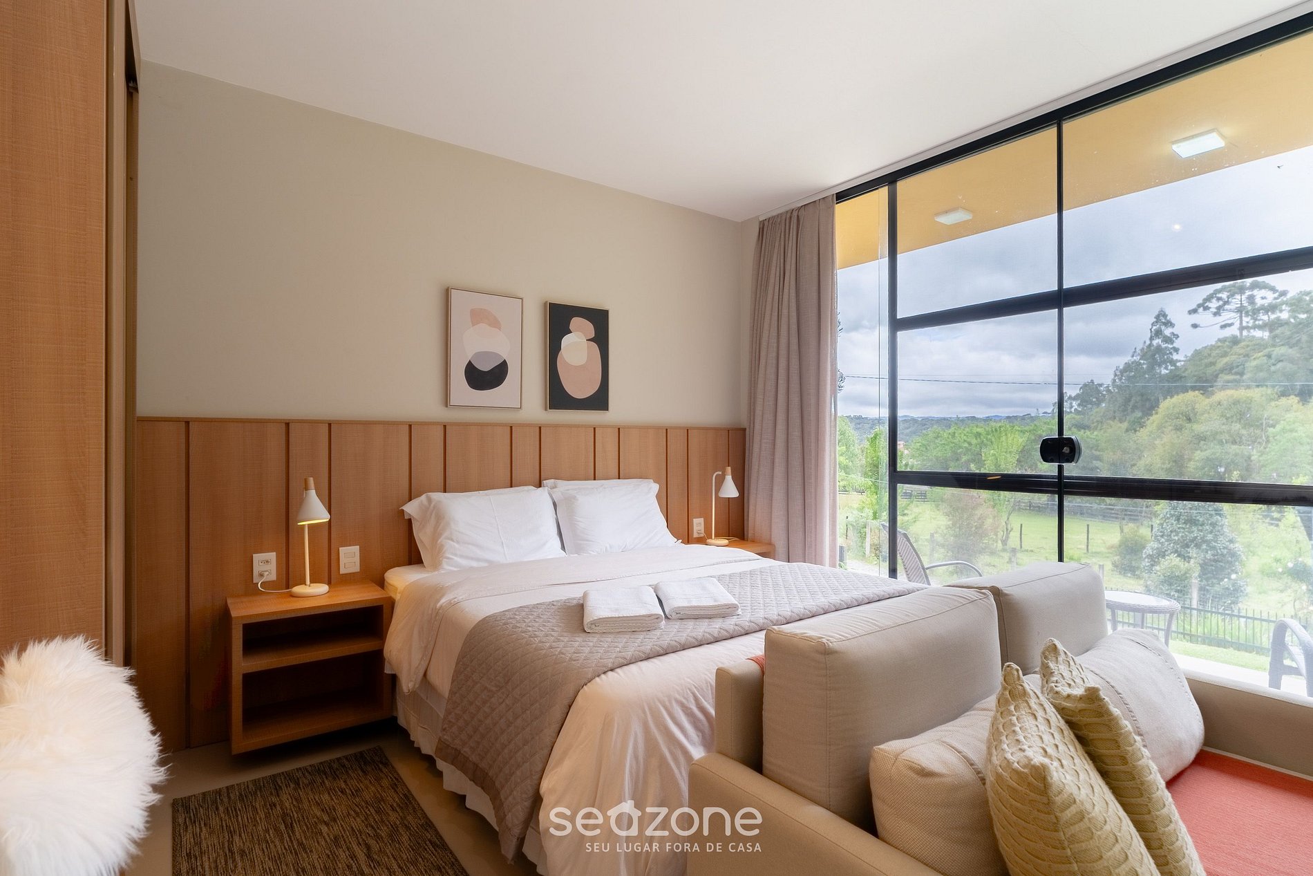 - 1 cama queen, sofá-cama solteiro, armário, smart TV, lareira e ar-condicionado;