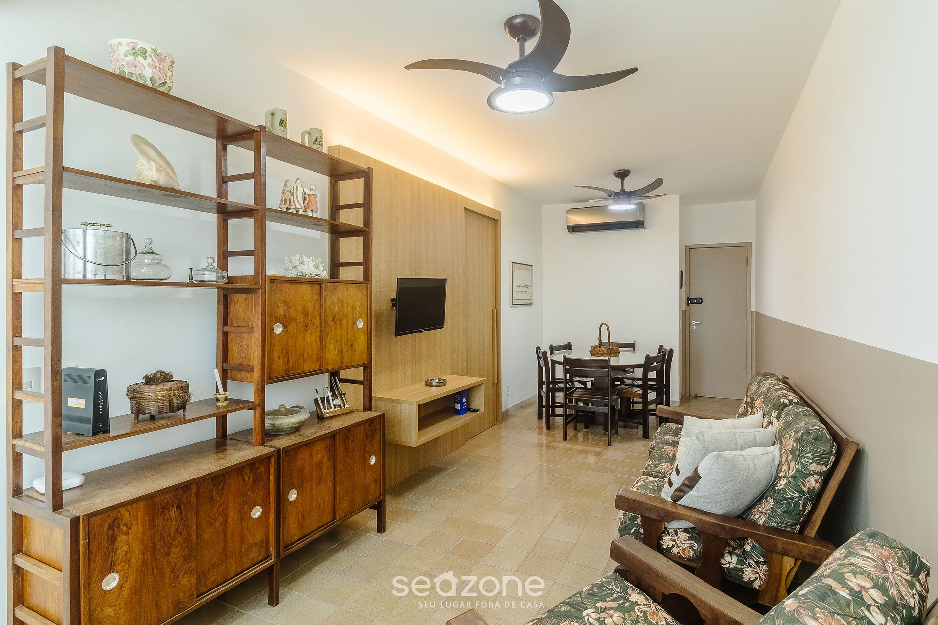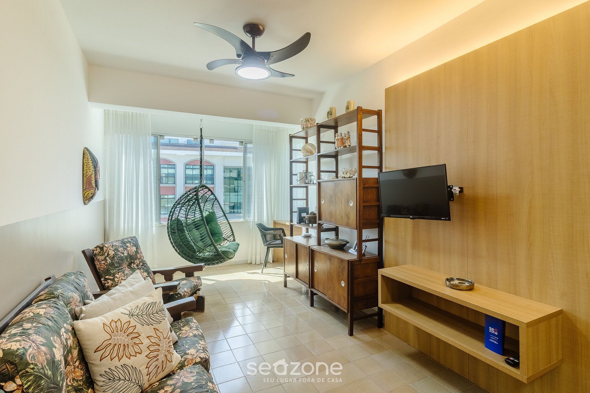 - Sala com com sofá, Smart TV, ar-condicionado e ventilador de teto; ;