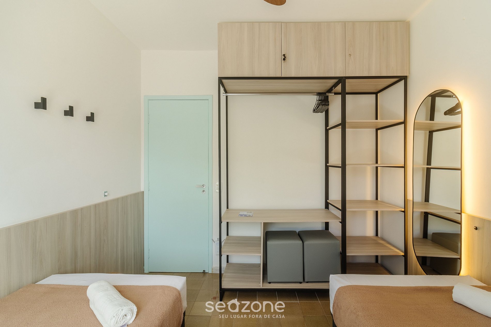 - 1 quarto com 2 camas de solteiro (há pillow top disponível para a junção das camas, formando uma cama queen), arara para roupas e ventilador de teto;