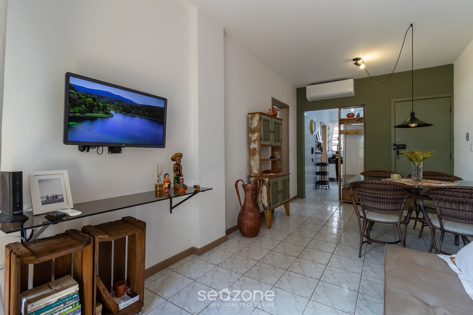 - Sala de estar com sofá e Smart TV;