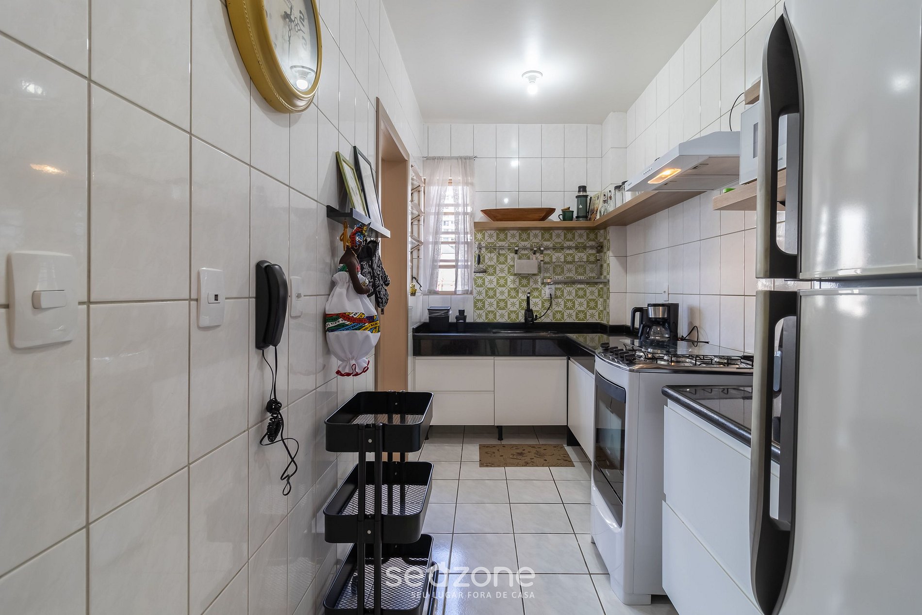 - Cozinha com geladeira, fogão, forno, micro-ondas, air fryer, cafeteira, chaleira elétrica, liquidificador, panelas, louças e utensílios;
