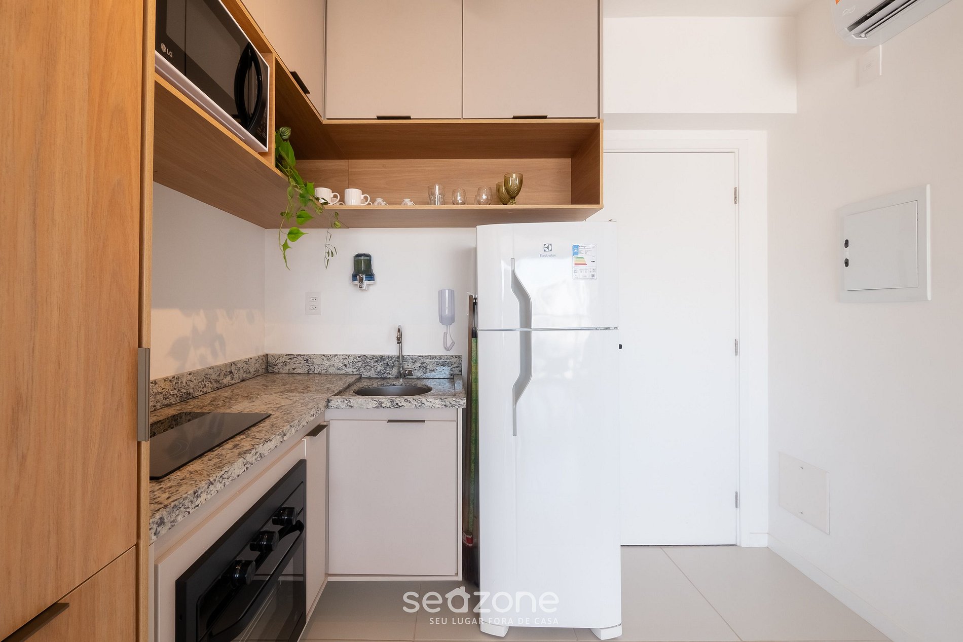 - Cozinha completa com geladeira, fogão cooktop por indução, forno elétrico, micro-ondas, sanduicheira, cafeteira elétrica, liquidificador, chaleira, taças de vinho, louças e utensílios.