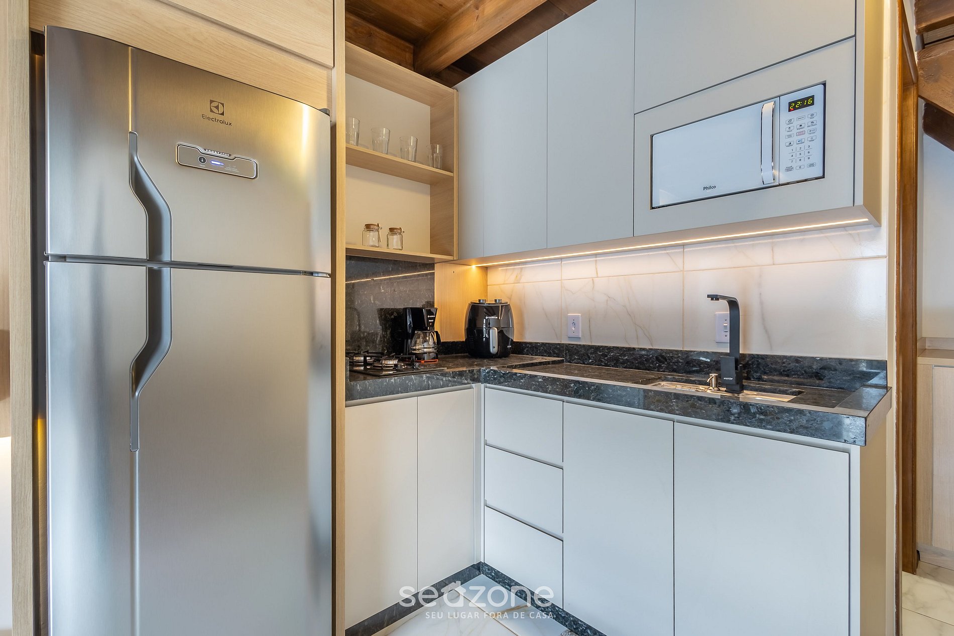 - Cozinha completa com geladeira, fogão cooktop à gás, microondas, Airfryer, sanduicheira, cafeteira elétrica, chaleira comum (leiteira), liquidificador, taças de vinho, panelas, louças e utensílios;