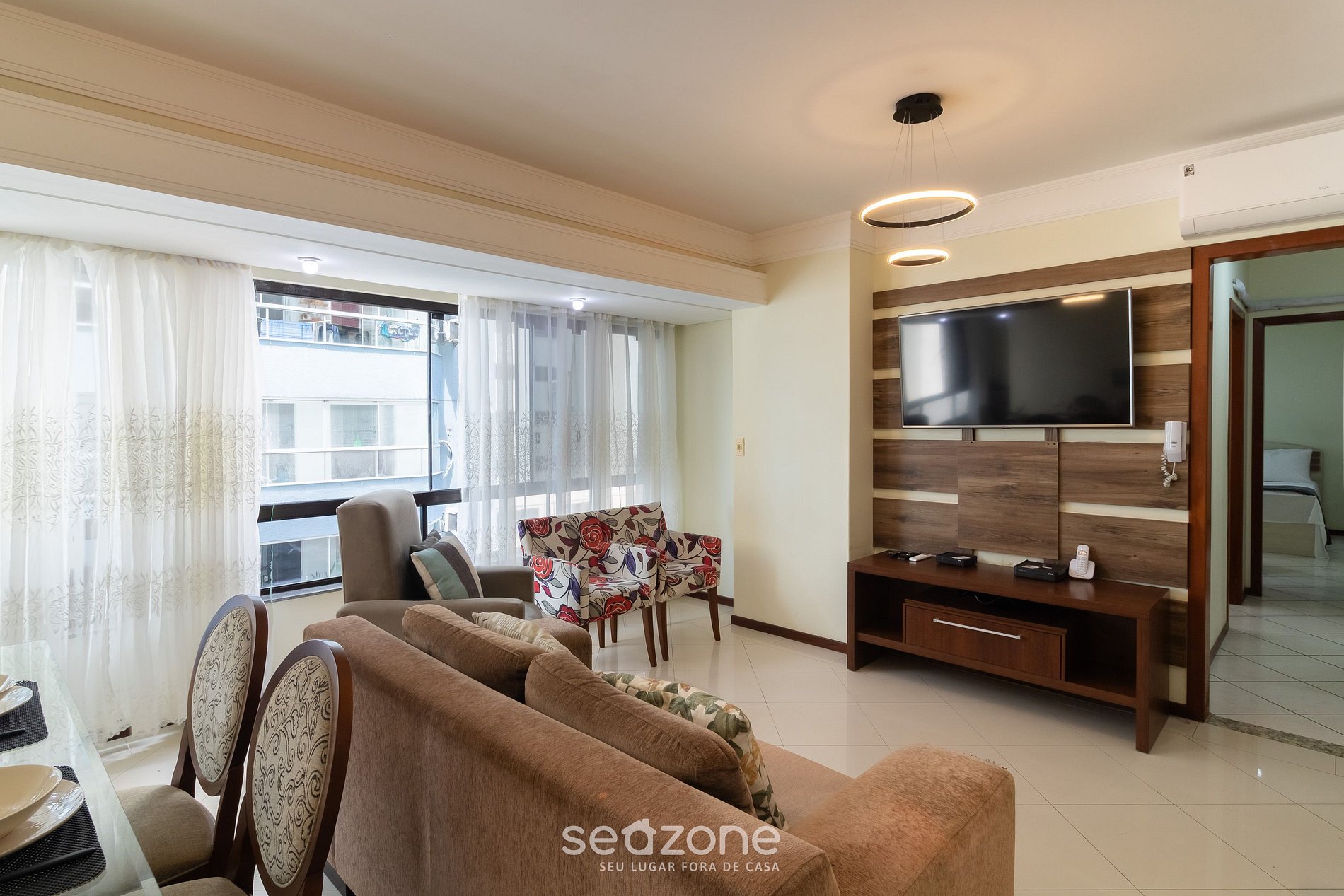 - Sala com com sofá, Smart TV e ar-condicionado;