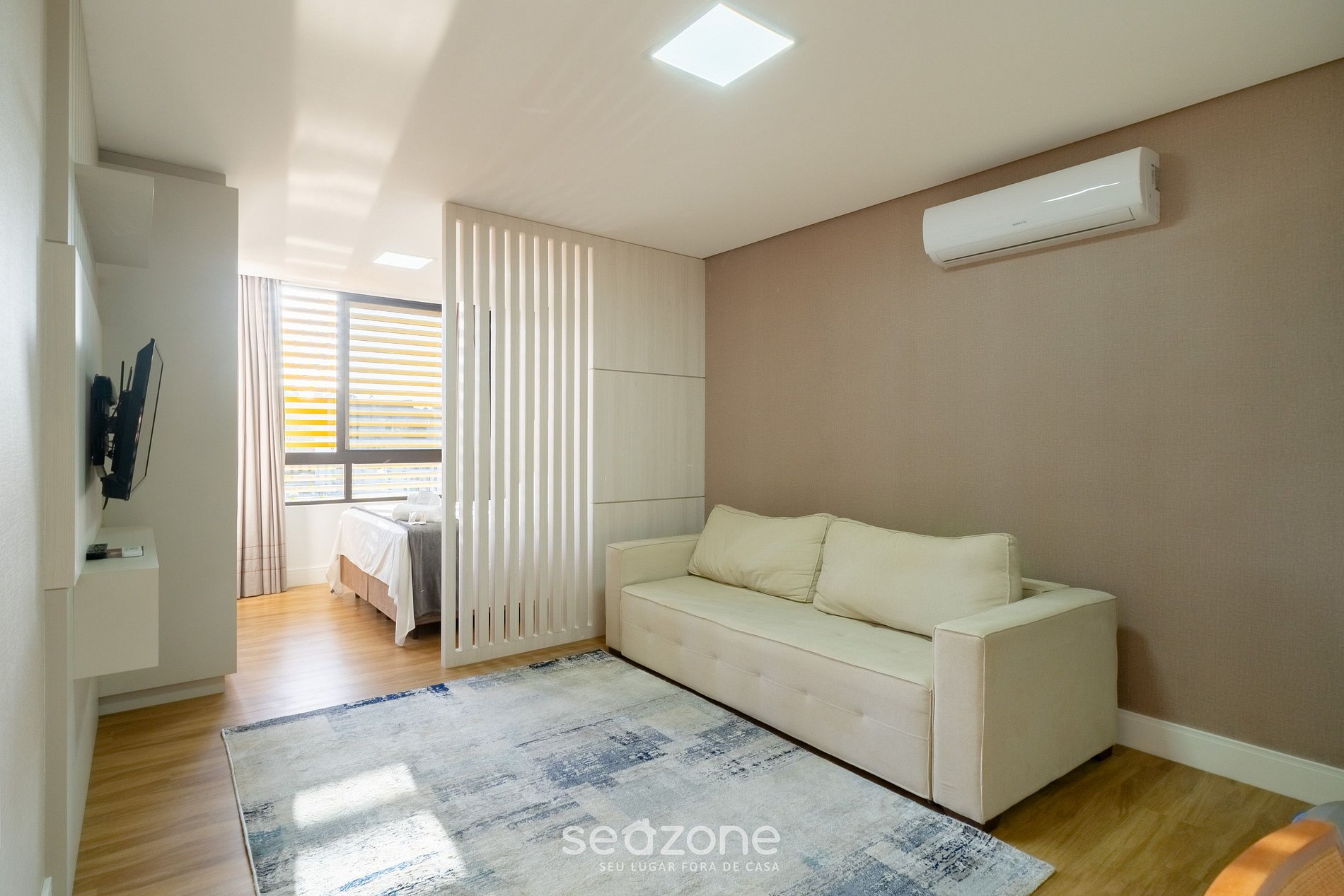 - Espaço com sofá-cama de casal, Smart Tv, sofá e ar-condicionado;
