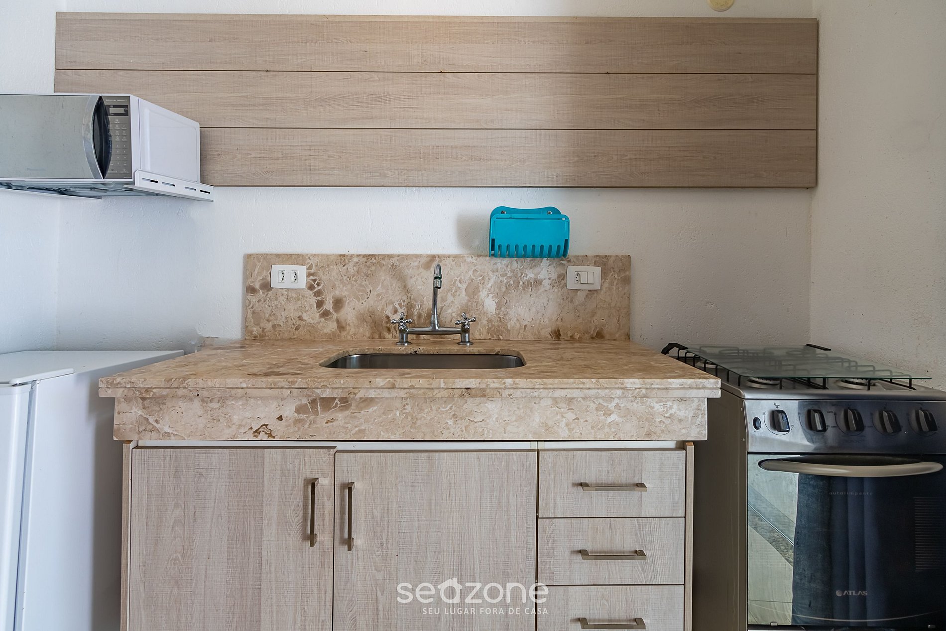 - Cozinha completa com frigobar, fogão, forno, microondas, liquidificador, panelas, louças e utensílios;