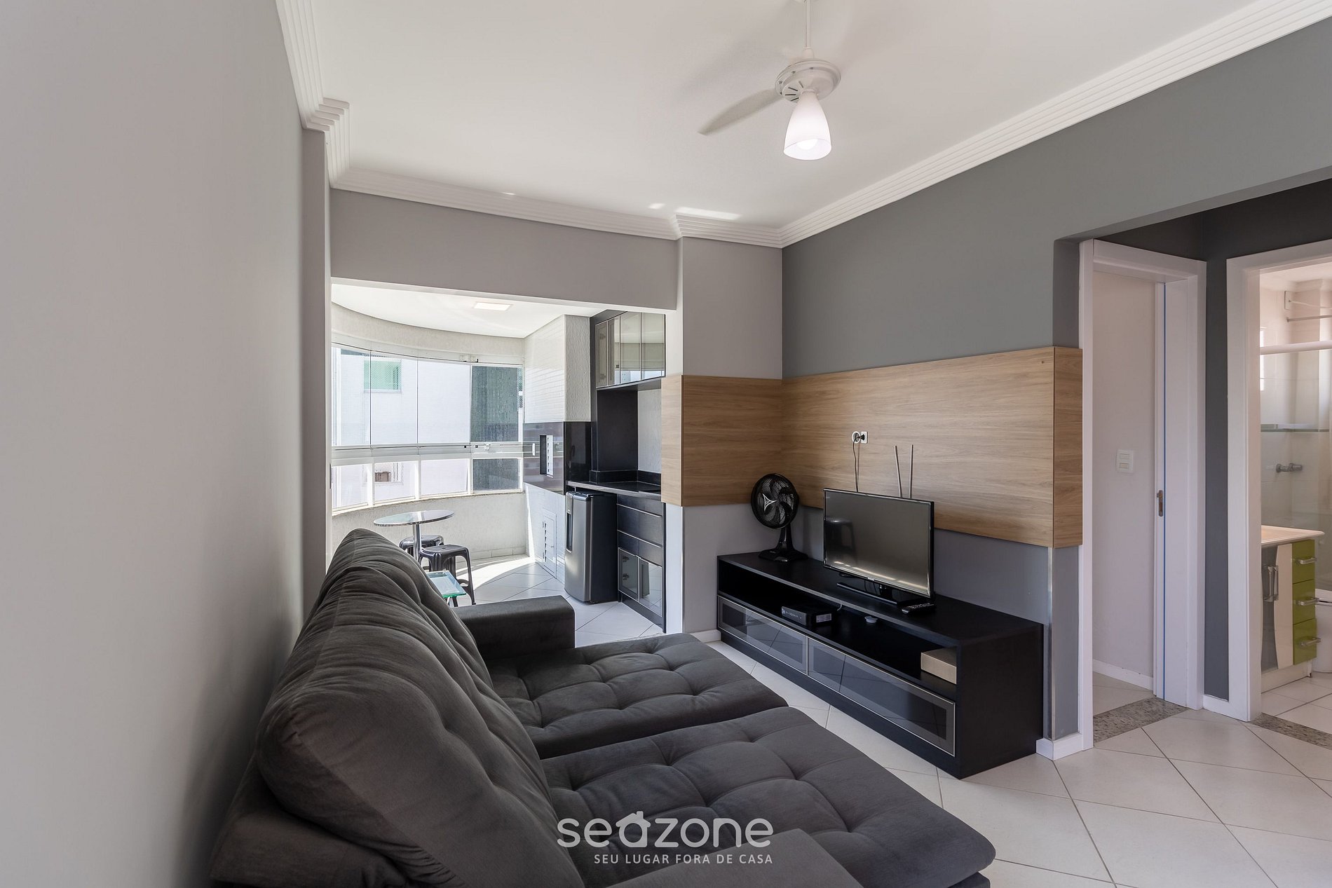 - Sala de estar com sofá, TV de tela plana e ventilador de teto;