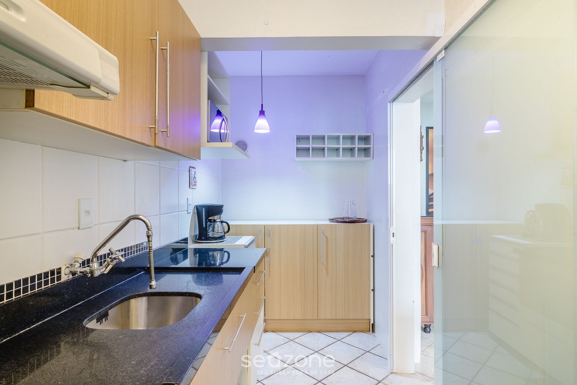 - Cozinha completa com geladeira, fogão cooktop a gás, forno elétrico, micro-ondas, sanduicheira, cafeteira elétrica, chaleira elétrica, liquidificador, batedeira, taças de vinho, panelas, louças e utensílios;