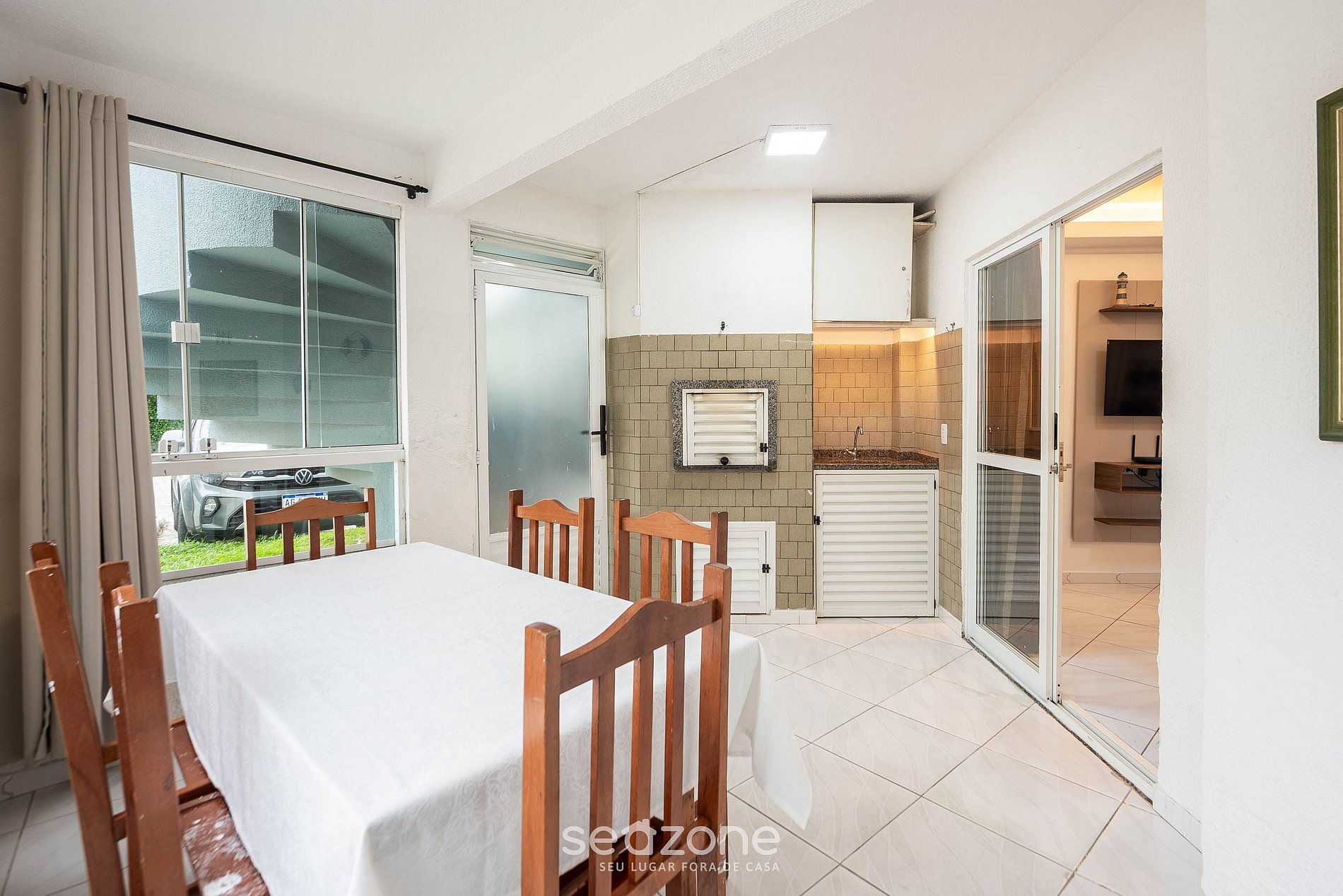 - Varanda com churrasqueira, mesa e cadeiras;