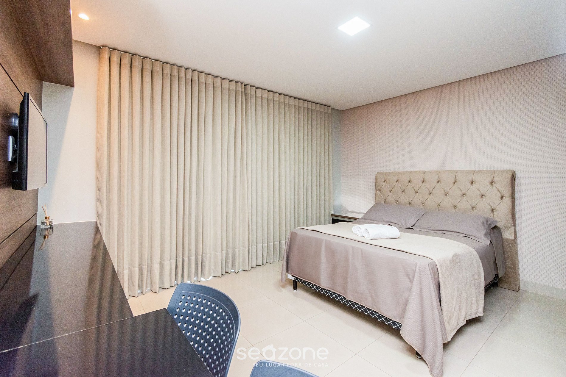 Tenha uma estadia completa neste flat moderno em Goiânia, Setor Bueno. Cozinha equipada, TV, Wi-Fi de alta velocidade e check-in sem chave e ar condicionado para você ter o máximo de conforto.