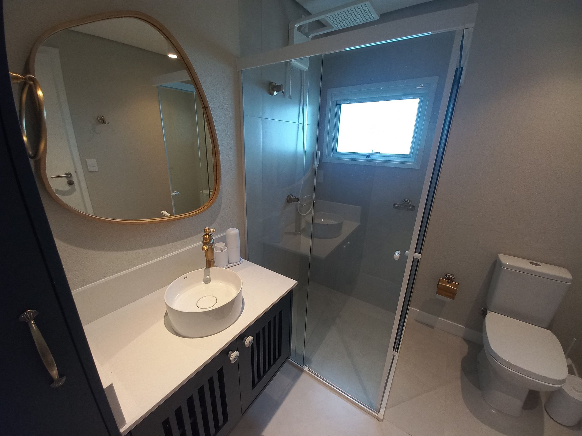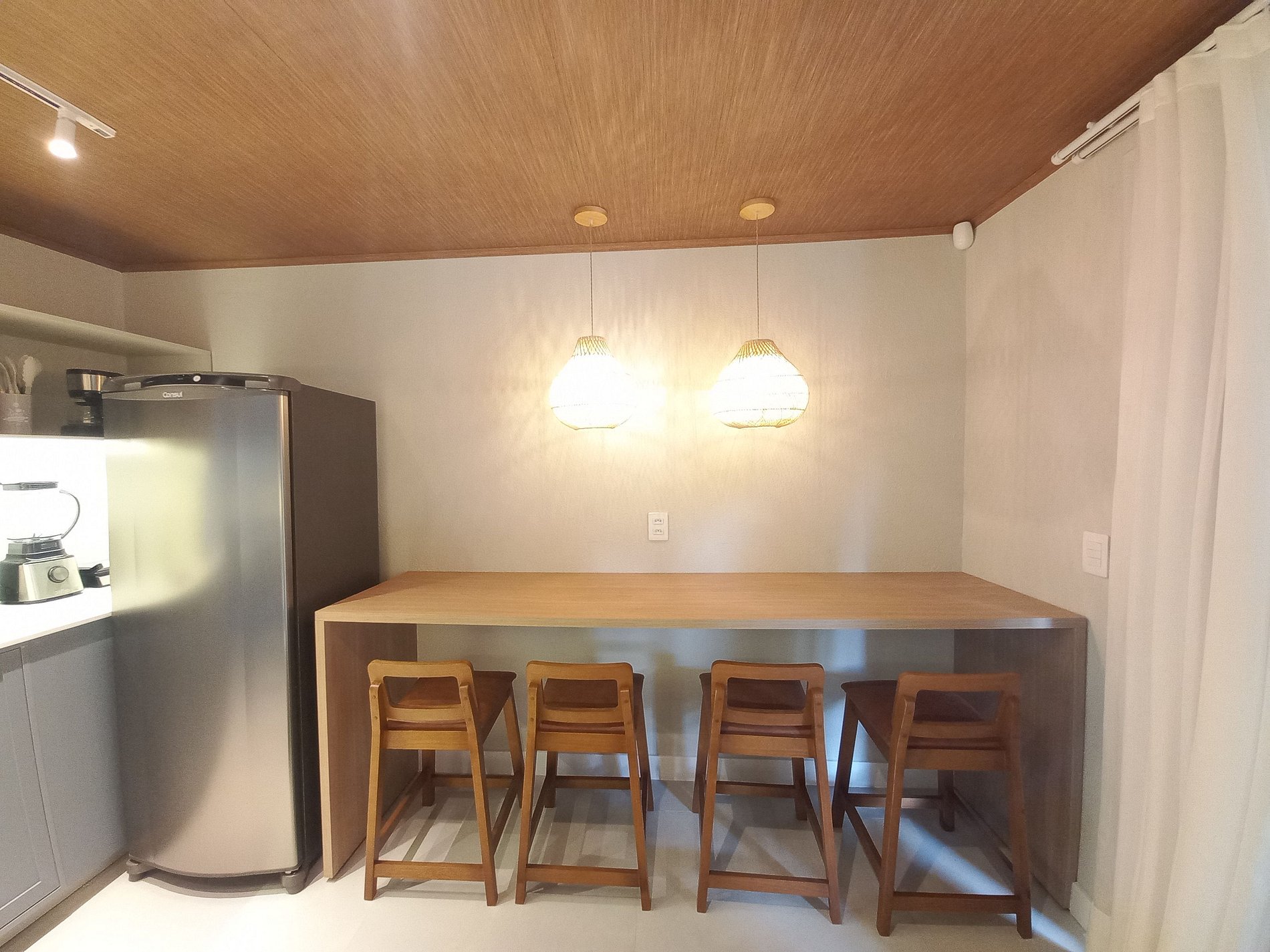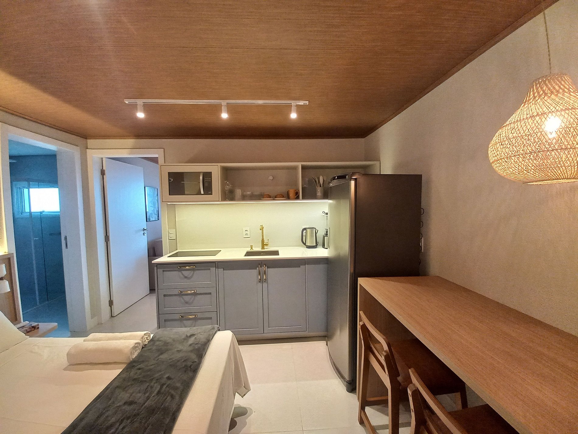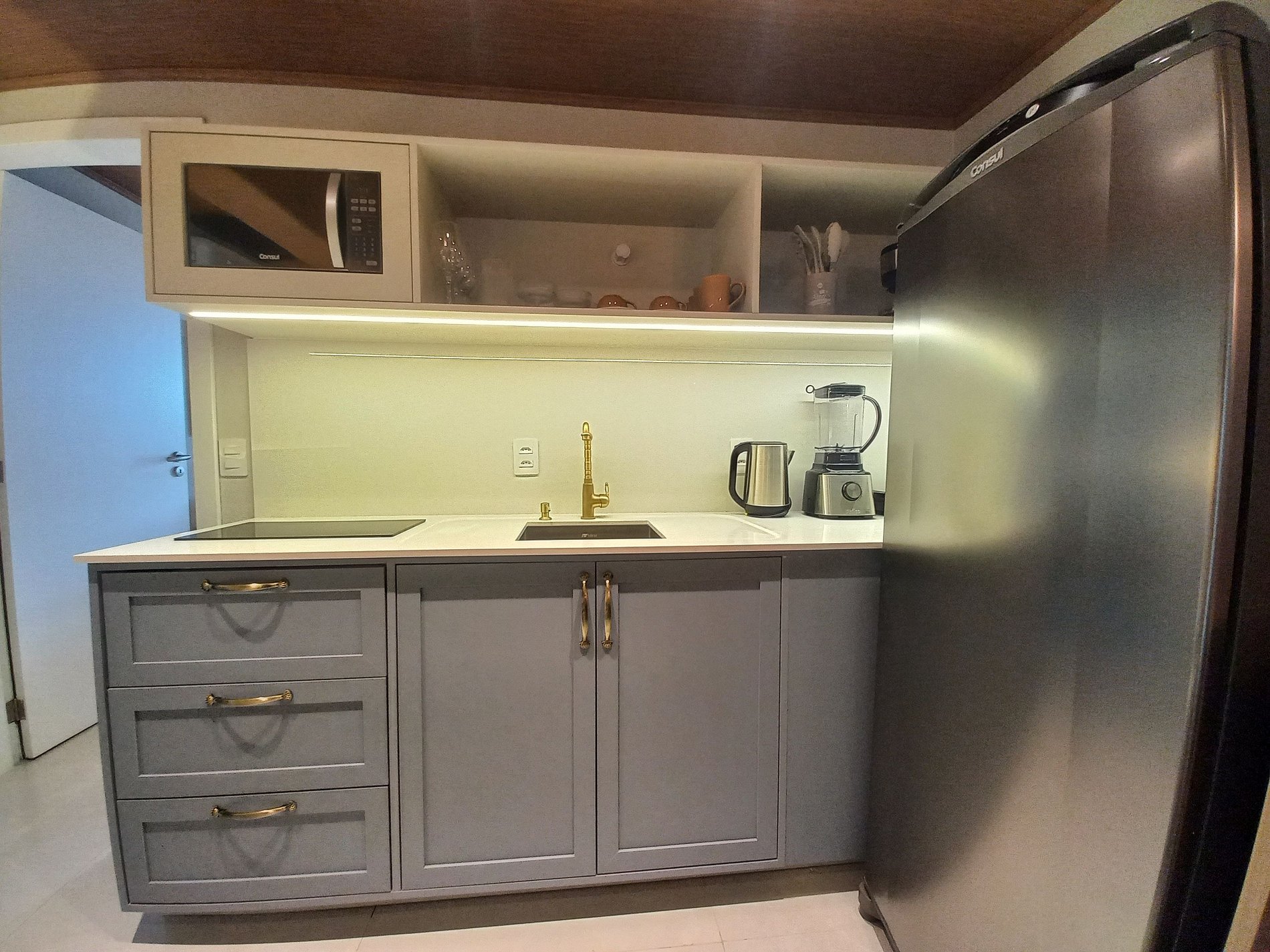 - Cozinha completa com geladeira, fogão cooktop (indução), micro-ondas, sanduicheira, cafeteira elétrica, chaleira elétrica, liquidificador, taças de vinho, panelas, louças e utensílios;