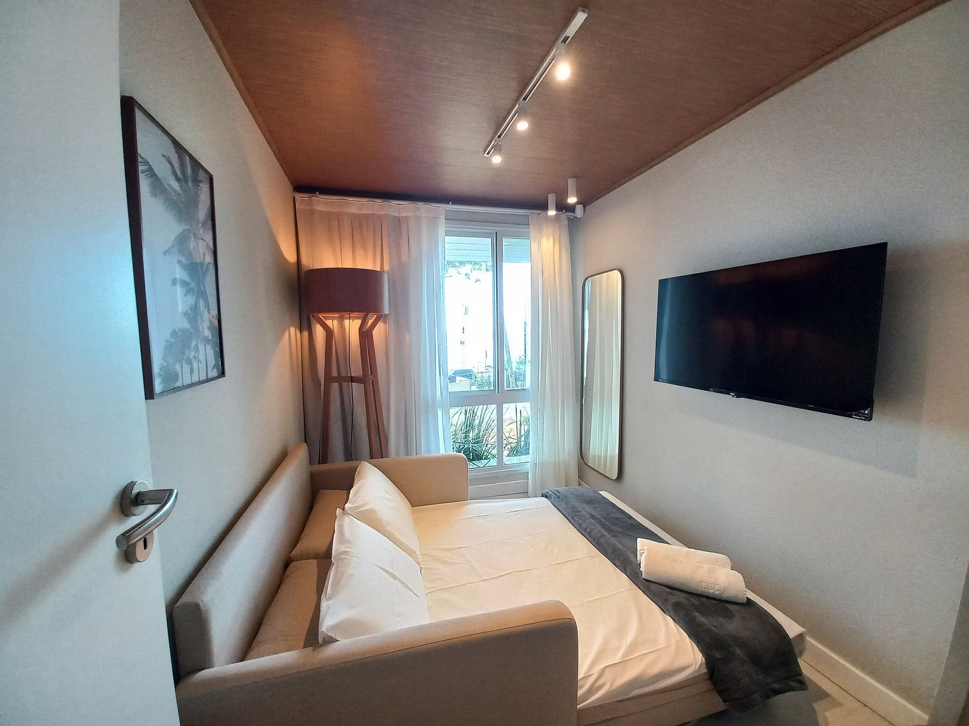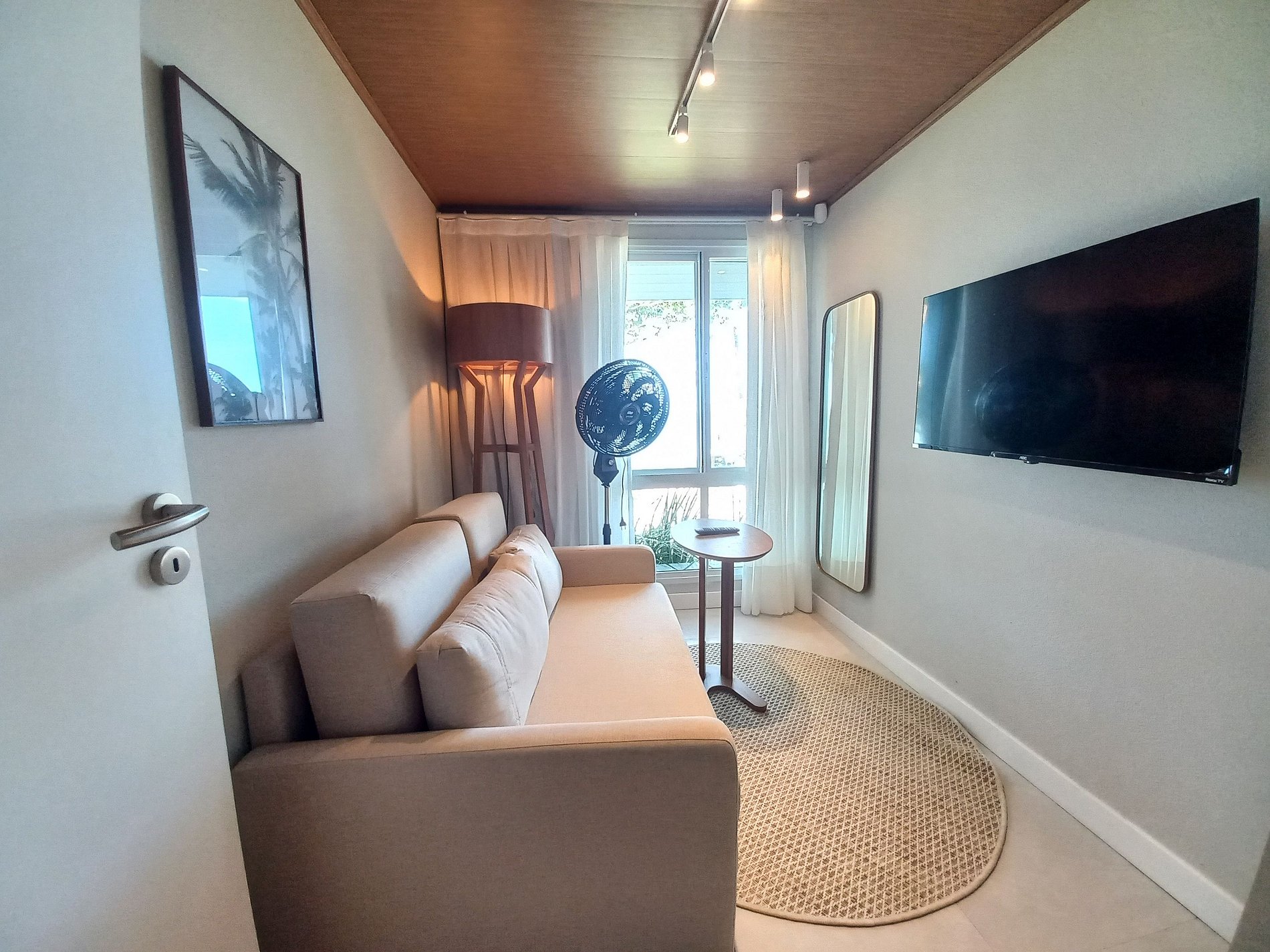 - Ambiente com Sofá-cama de casal, ventilador portátil e Smart TV;