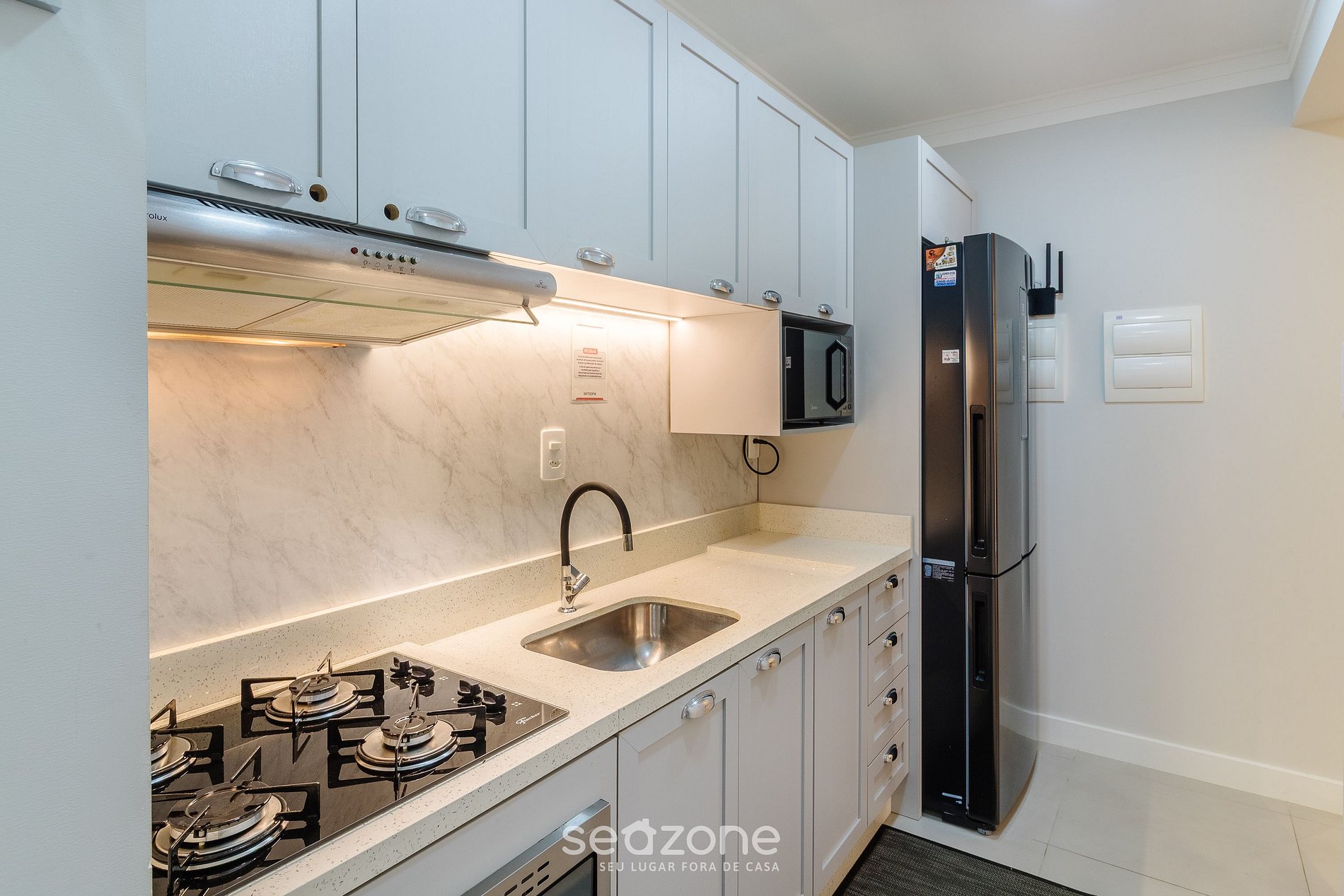- Cozinha completa com geladeira, fogão cooktop (gás), forno elétrico, micro-ondas, Airfryer, Kit café (suporte para filtro, garrafa térmica), chaleira elétrica, sanduicheira, liquidificador, taças de vinho, panelas, louças e utensílios;