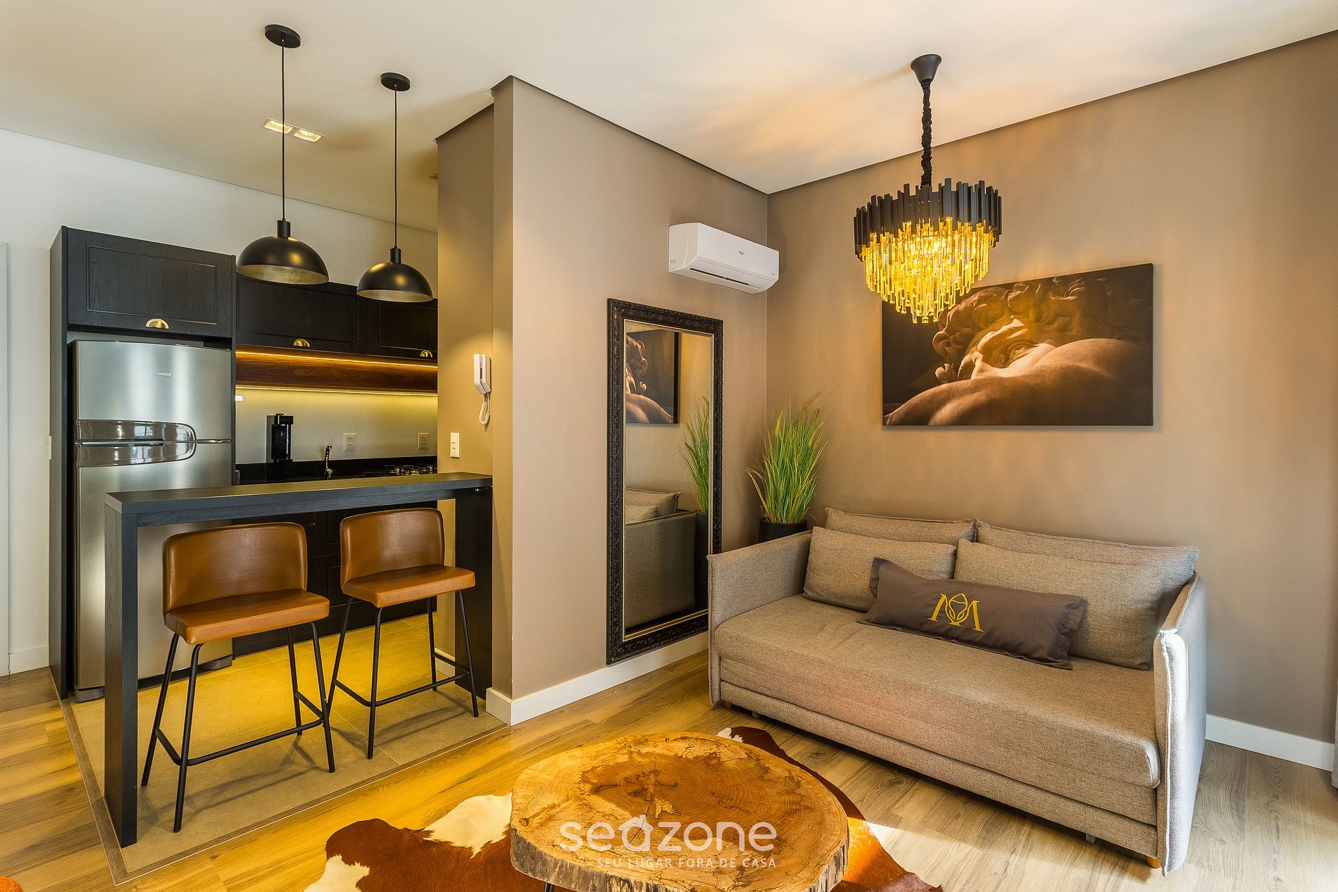 Apto sofisticado no Centro de Gramado, com projeto contemporâneo e acabamentos selecionados. Dispõe de quarto confortável, sala integrada com sofá-cama, cozinha completa com bancada e varanda com vista para a Praça das Etnias. Conta ainda com vaga de garagem coberta. Ao lado da Pizzaria Cara de Mau e próximo aos principais atrativos da cidade.