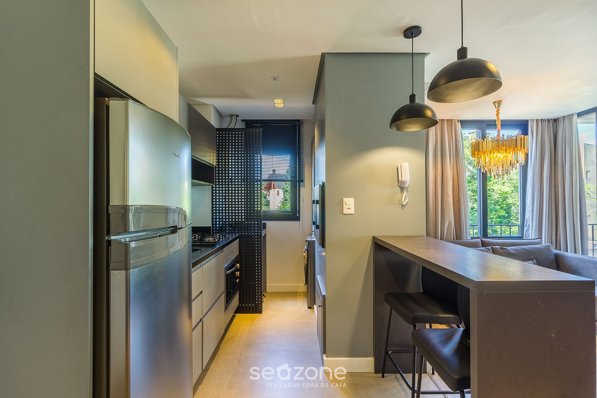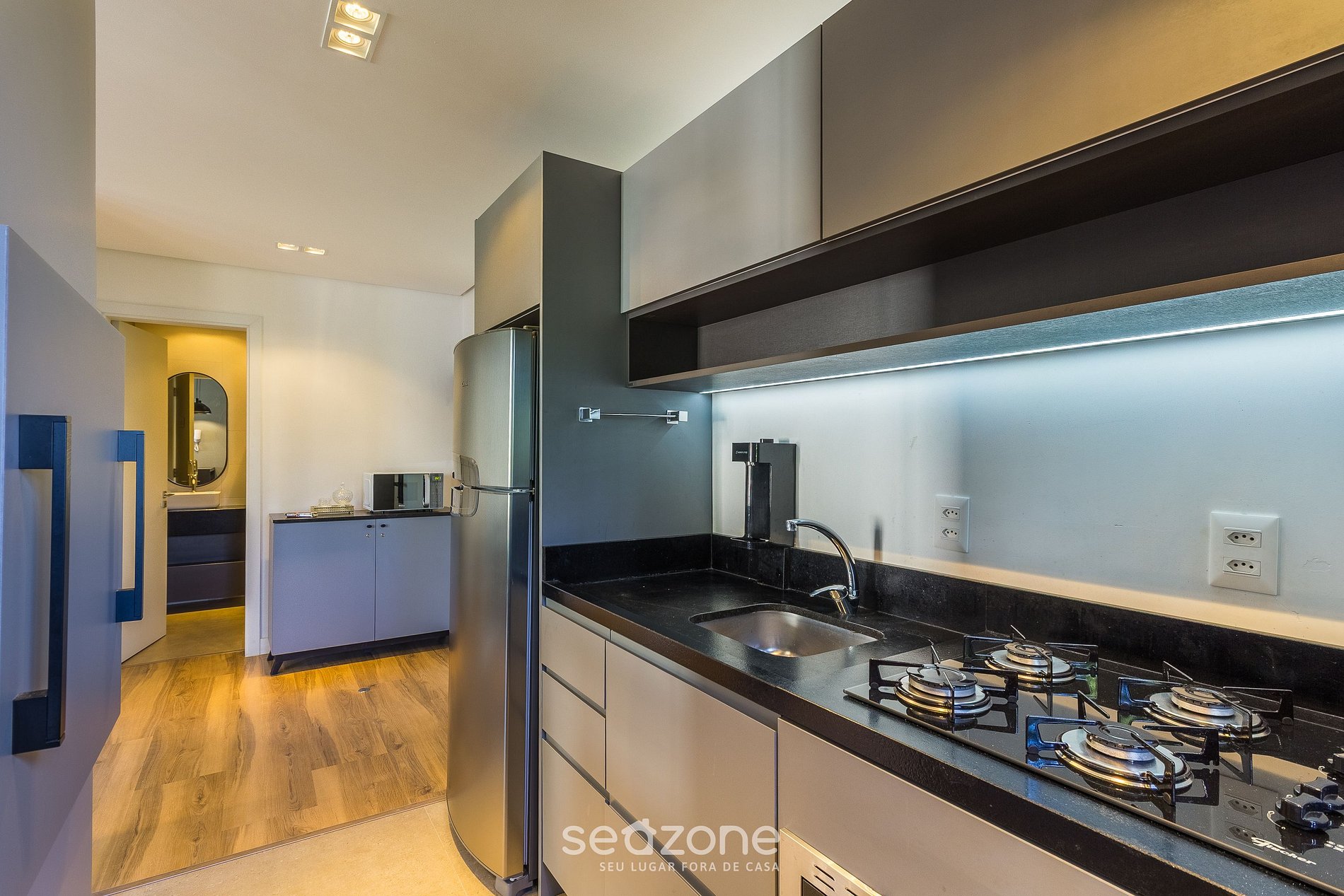 - Cozinha completa com geladeira, fogão cooktop a gás, forno elétrico, micro-ondas, sanduicheira, Kit café (suporte para filtro, garrafa térmica), chaleira elétrica, liquidificador, taças de vinho, panelas, louças e utensílios;
