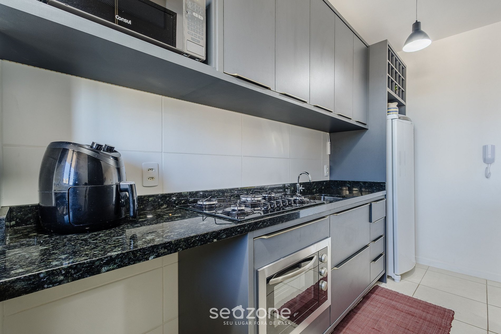 - Cozinha completa com geladeira, fogão cooktop (gás), forno elétrico, airfryer, micro-ondas, sanduicheira, cafeteira elétrica, chaleira elétrica, liquidificador, taças de vinho, panelas, louças e utensílios;