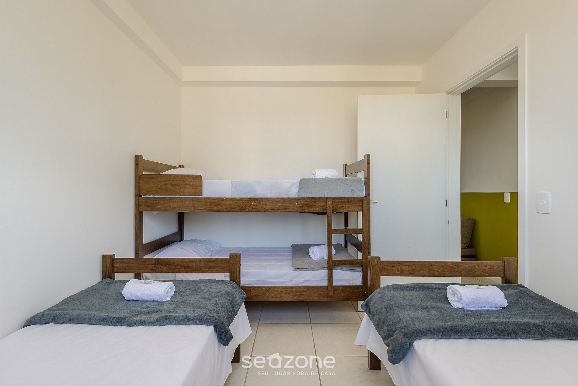 - 1 Quarto com 2 camas de solteiro, cama beliche para 2 pessoas e ar-condicionado;
