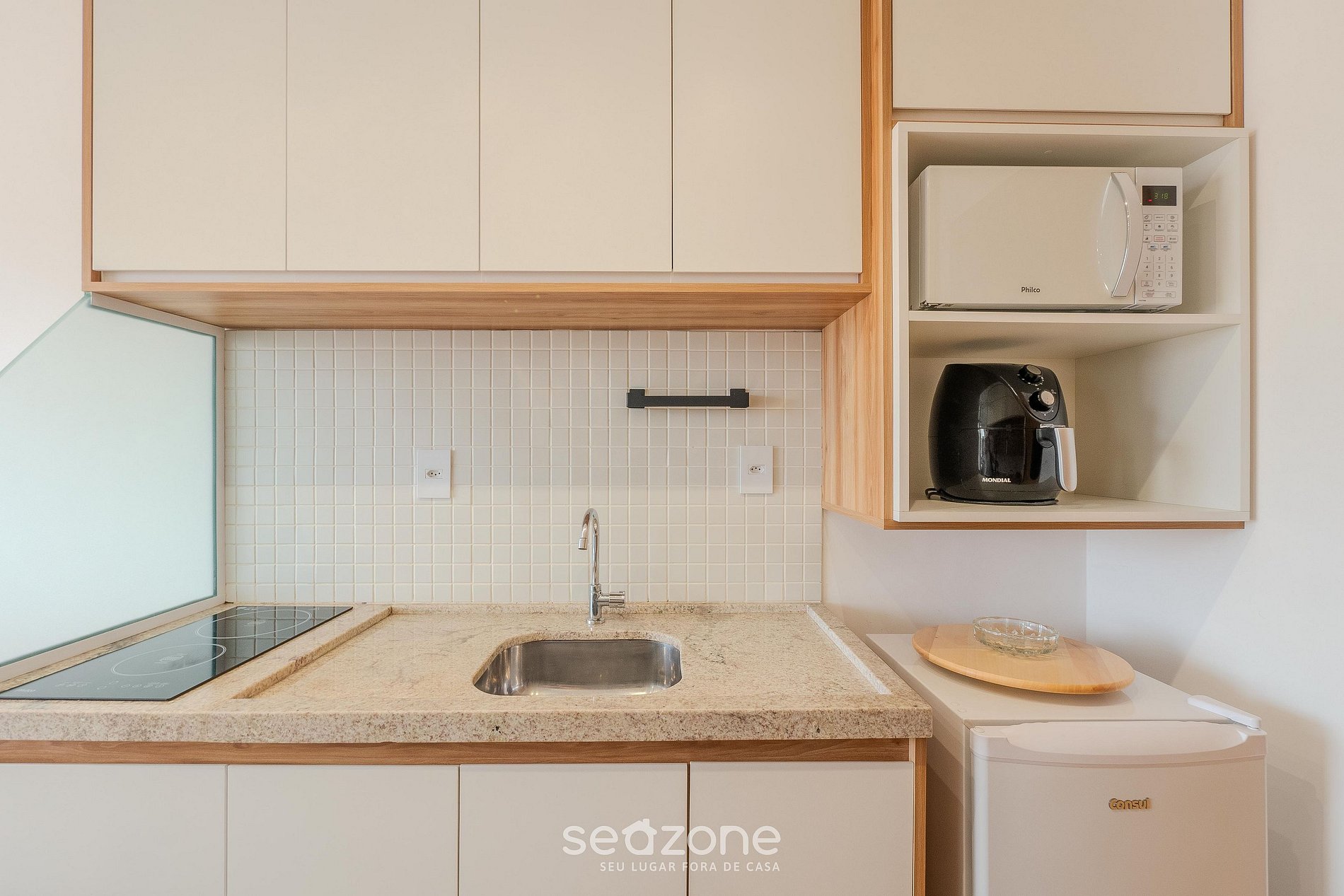 - Cozinha completa com frigobar, fogão cooktop por indução, micro-ondas, sanduicheira, cafeteira elétrica, airfryer, liquidificador, taças de vinho, panelas, louças e utensílios;