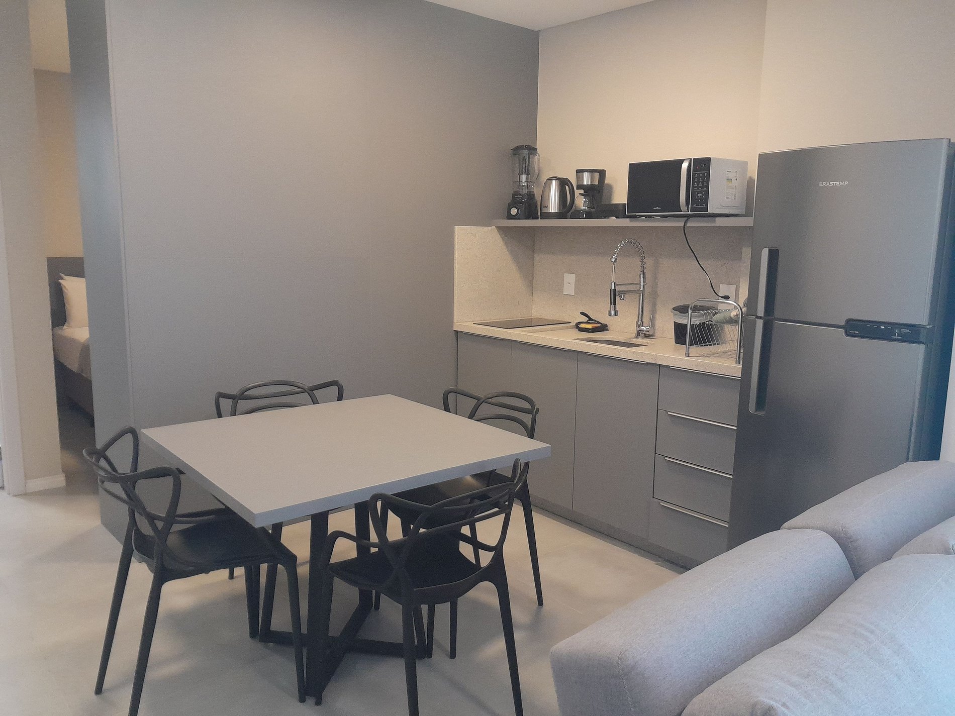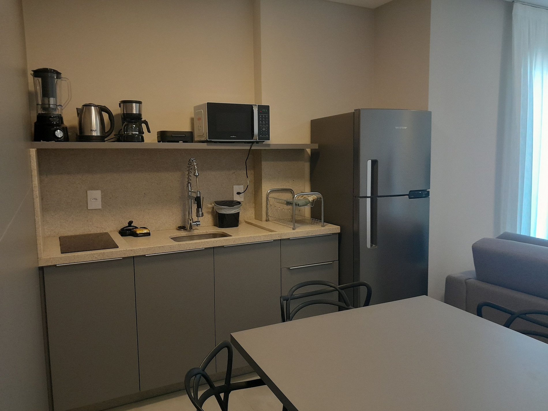 - Cozinha completa com geladeira, fogão cooktop (indução), micro-ondas, sanduicheira, cafeteira elétrica, chaleira elétrica, liquidificador, taças de vinho, panelas, louças e utensílios;