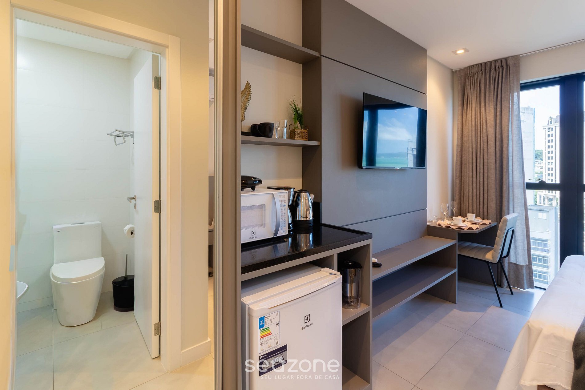 - Cozinha compacta com micro-ondas (sua opção prática para refeições rápidas durante a estadia), além de frigobar, cafeteira elétrica, chaleira elétrica, sanduicheira, liquidificador, taças de vinho, louças e utensílios essenciais para o dia a dia.