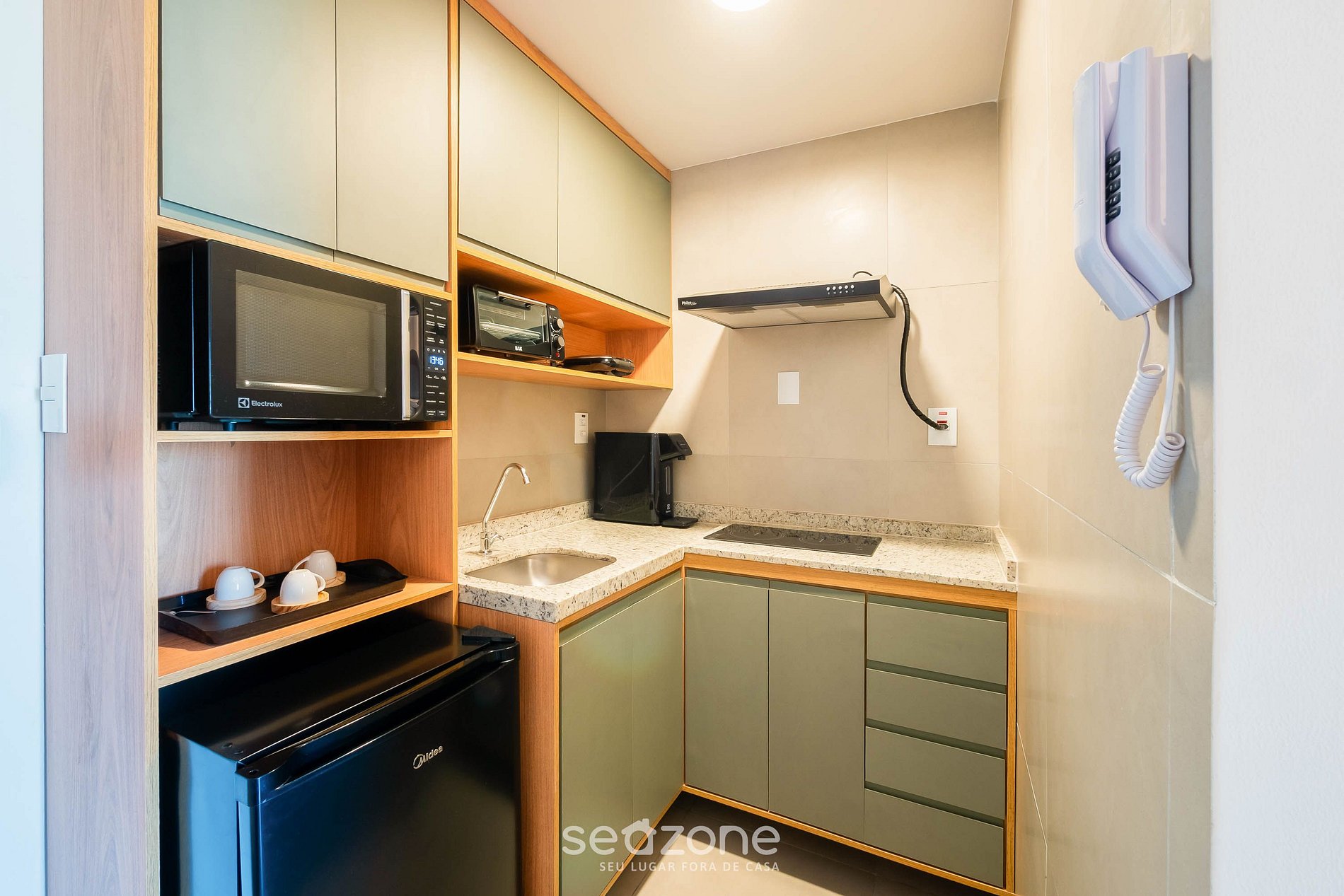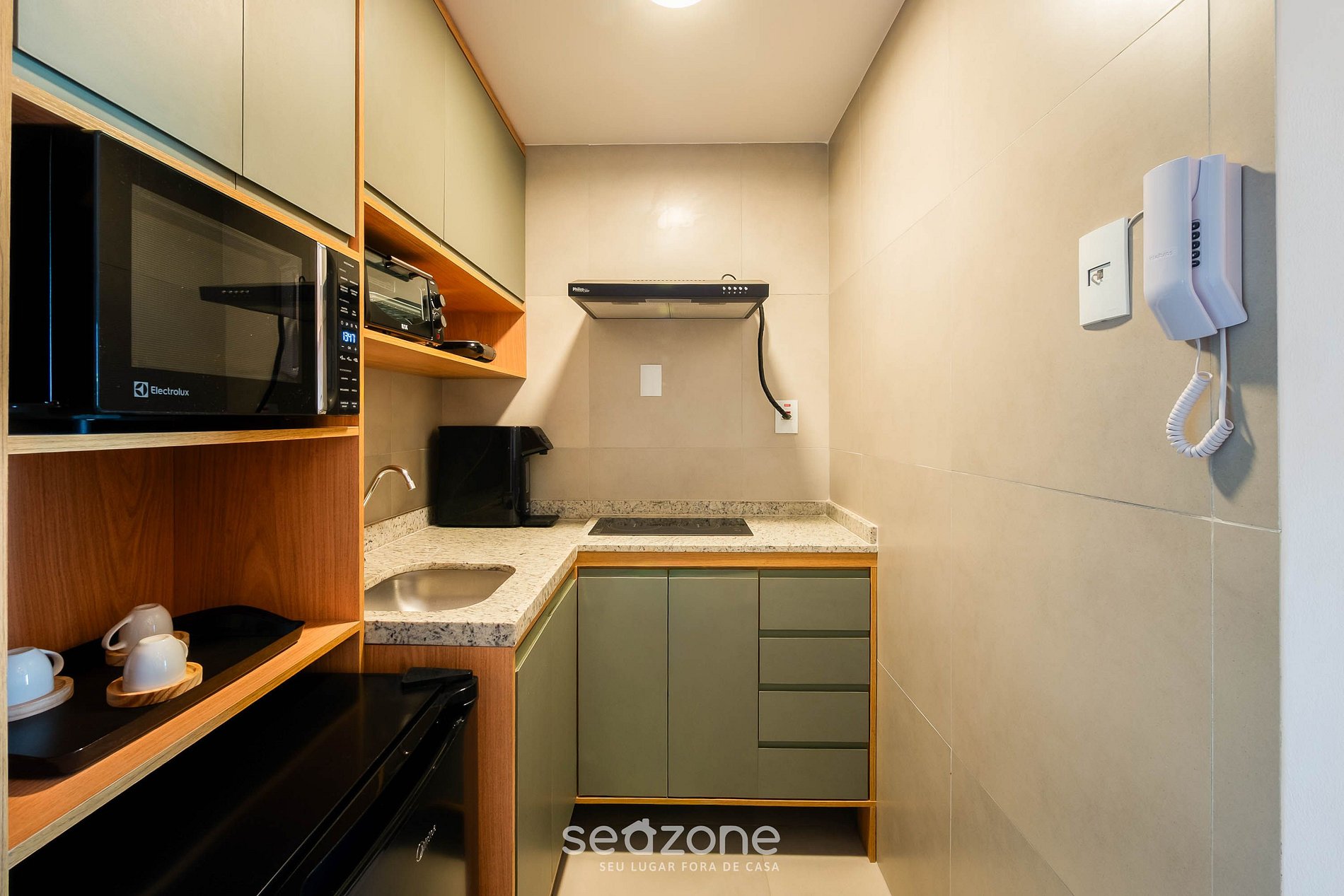 - Cozinha completa com frigobar, fogão cooktop por indução, forno elétrico, microondas, sanduicheira, cafeteira elétrica, chaleira comum, liquidificador, taças de vinho, panelas, louças e utensílios;