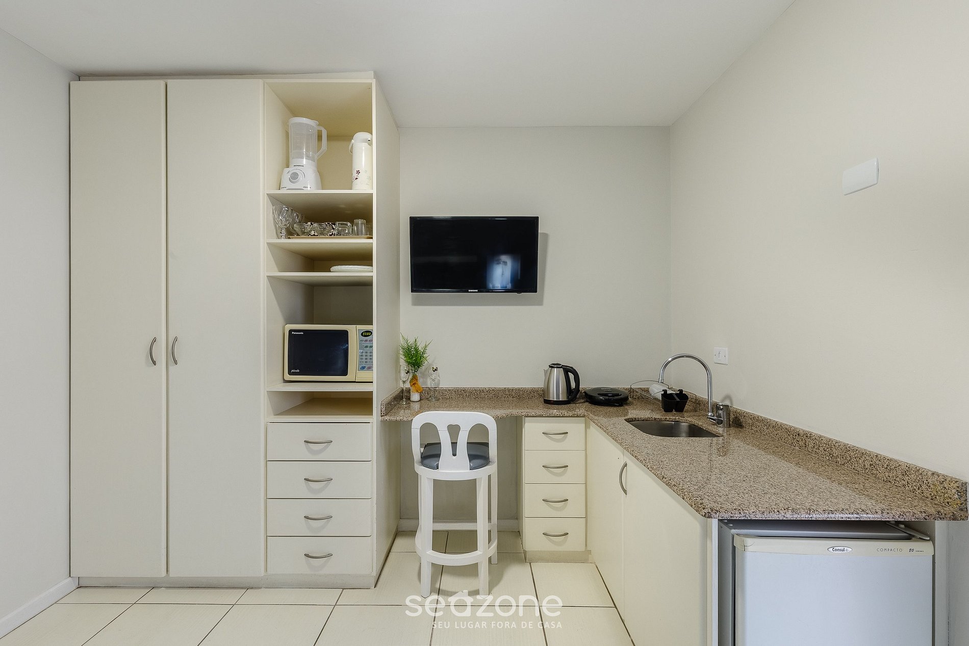 - Cozinha compacta com frigobar, microondas, louças e utensílios;