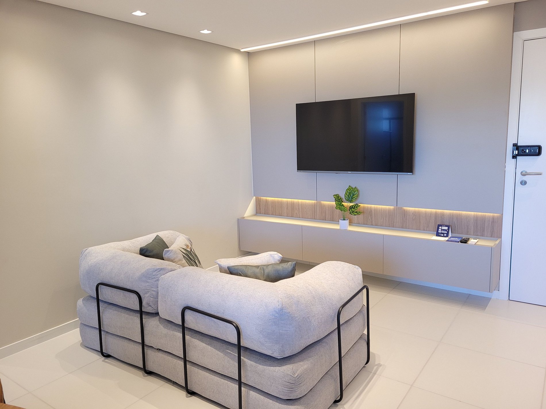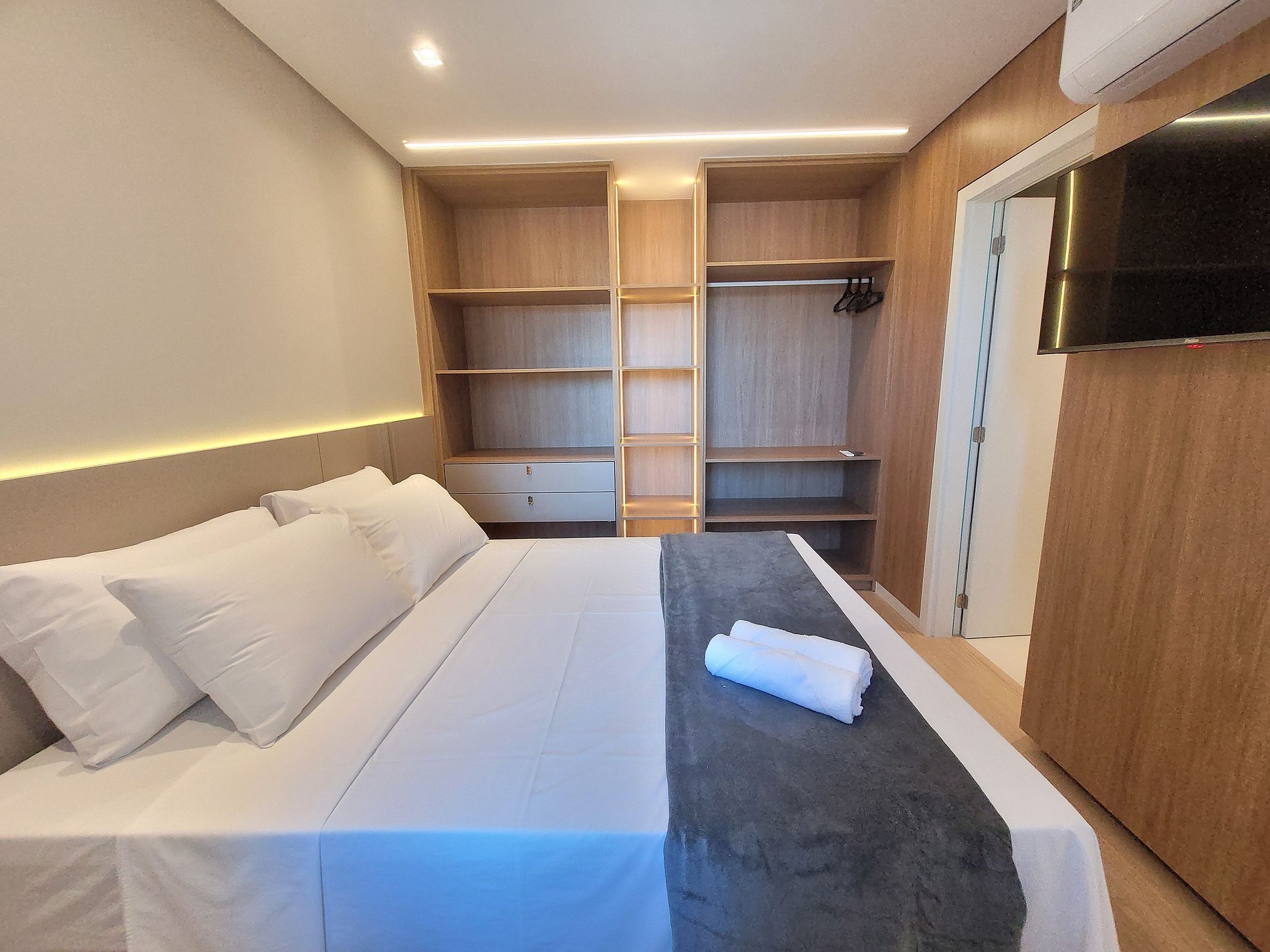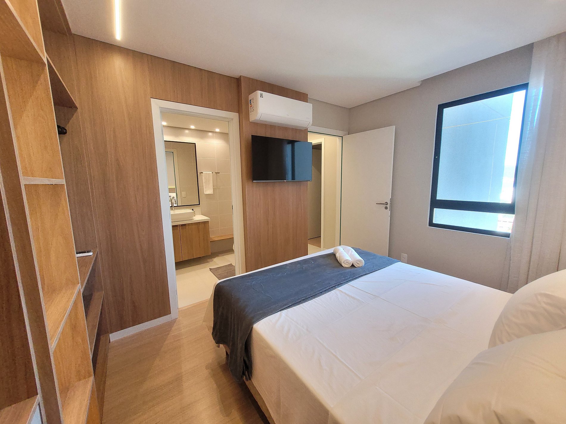 - 1 Suíte com cama queen, armário, smart TV e ar-condicionado;
