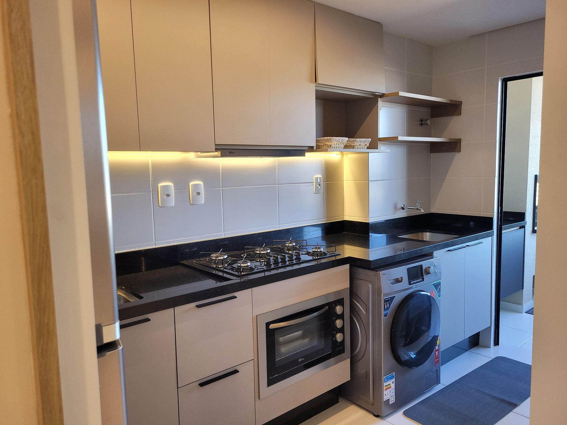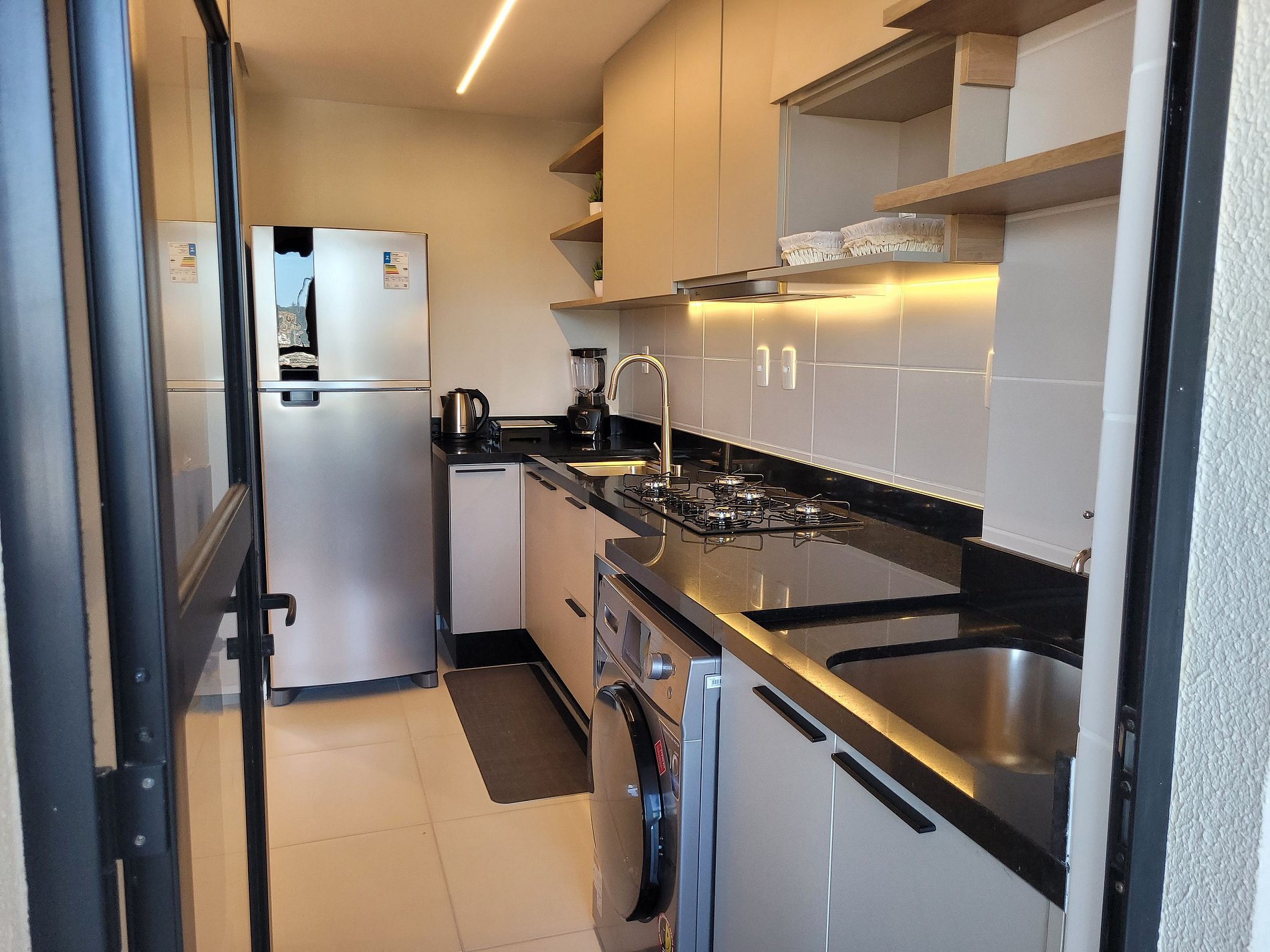 - Cozinha completa com geladeira, fogão cooktop (gás), forno elétrico, sanduicheira, cafeteira elétrica, chaleira elétrica, liquidificador, taças de vinho, panelas, louças e utensílios;