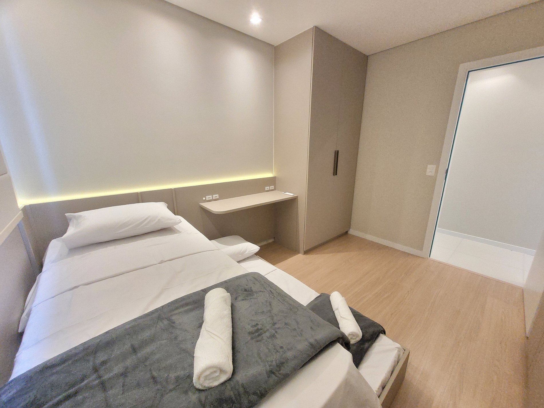 - 1 Quarto com cama de solteiro, cama auxiliar de solteiro, armário e ar-condicionado;