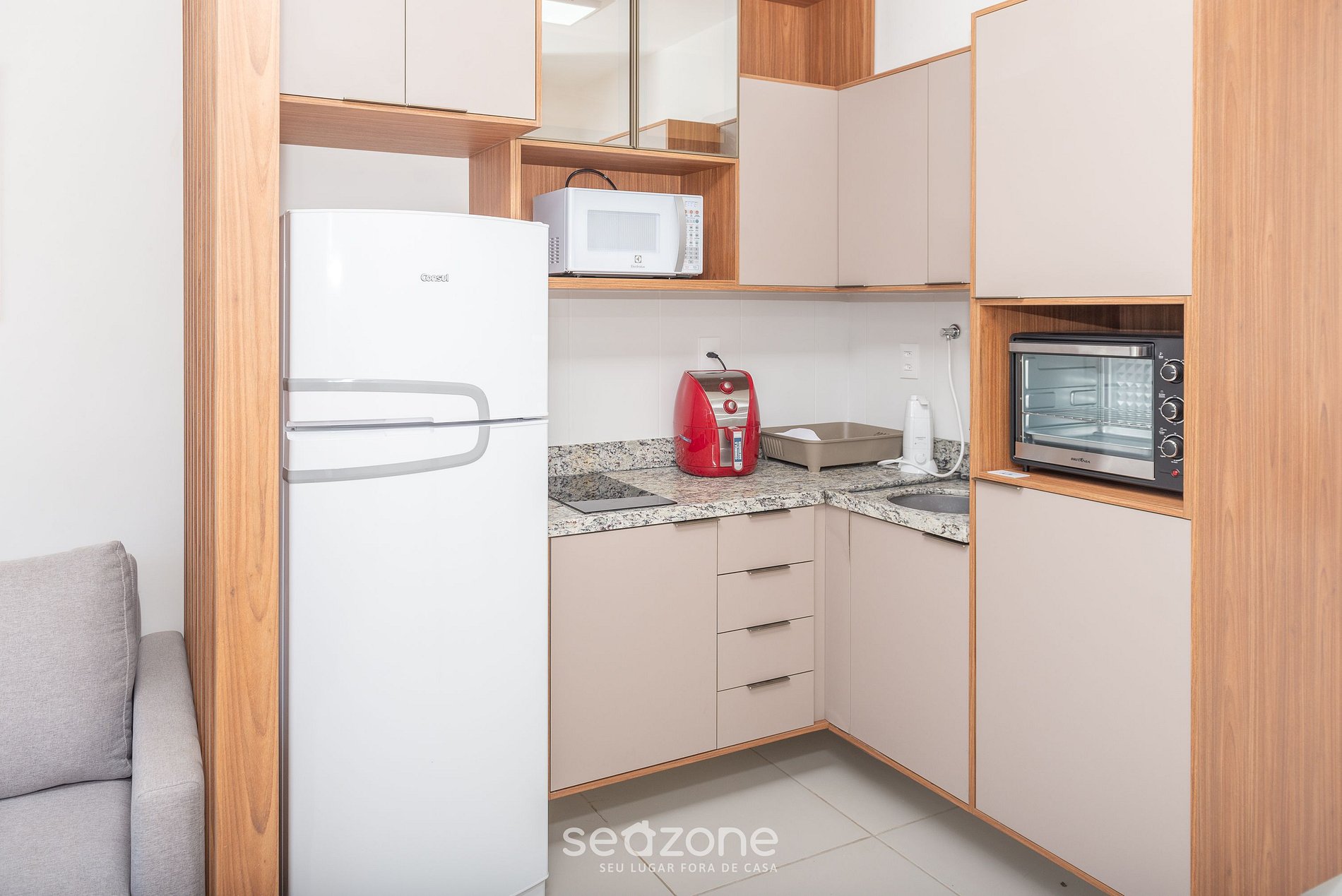 - Cozinha completa com geladeira, fogão cooktop, forno elétrico, micro-ondas, sanduicheira, cafeteira, Air-fryer, liquidificador, panelas, louças, taças e utensílios;