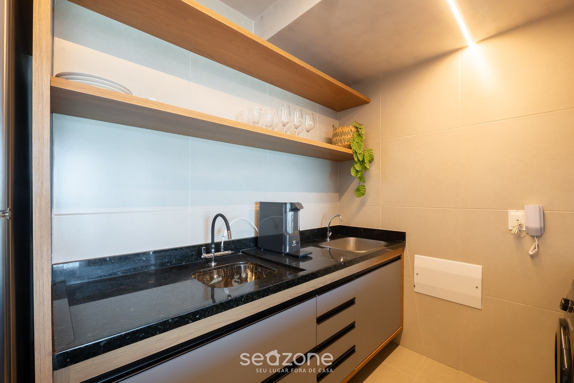- Cozinha completa com geladeira, fogão cooktop por indução, forno elétrico, micro-ondas, sanduicheira, cafeteira elétrica, liquidificador, taças de vinho, panelas, louças e utensílios;