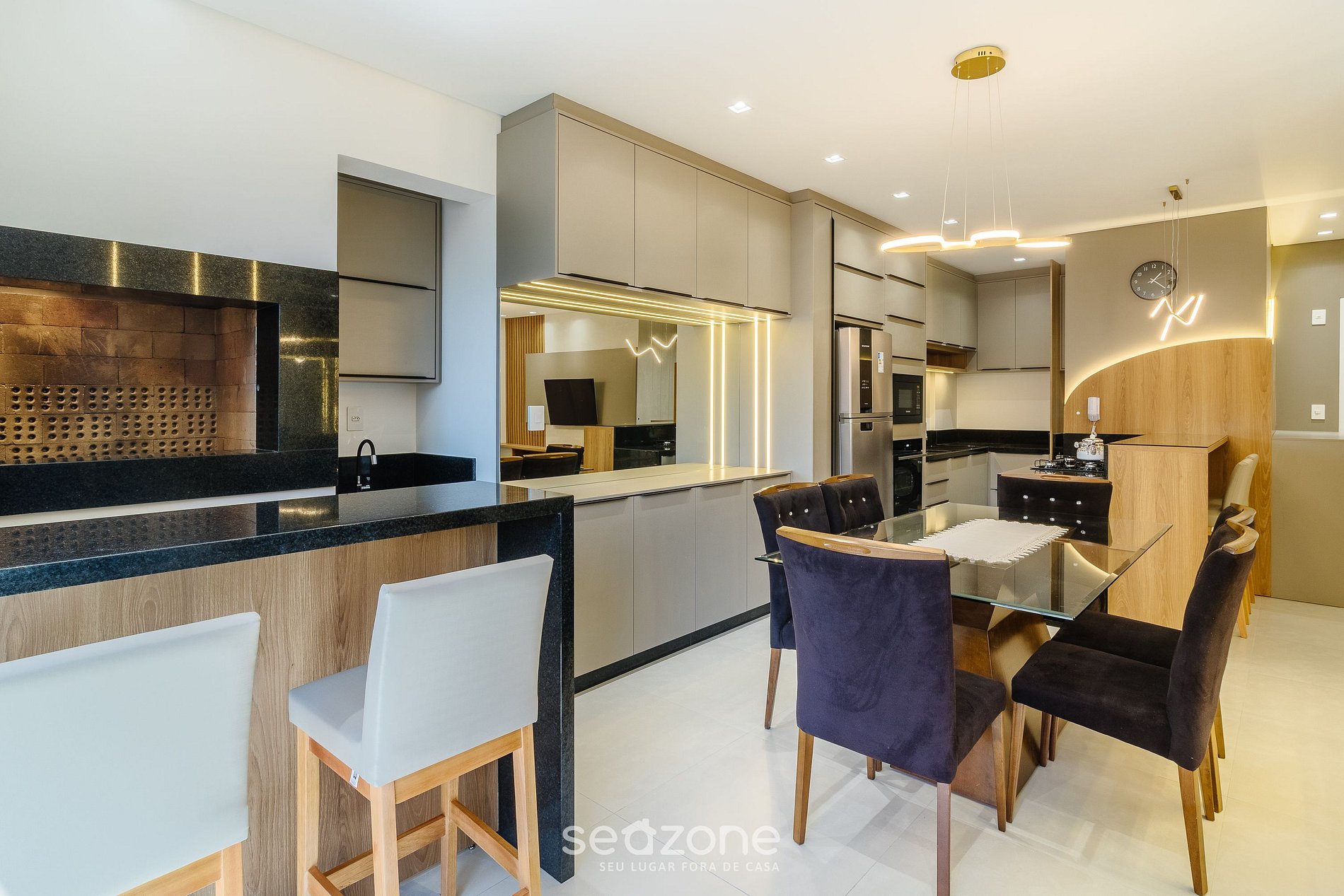 - Área de jantar e espaço gourmet com churrasqueira, sofá, mesa e cadeiras;