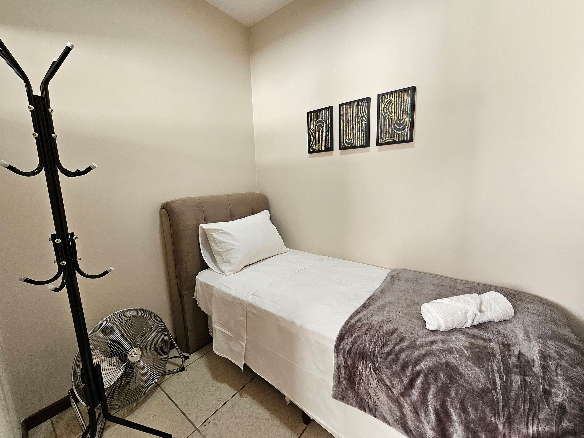 - 1 Quarto com cama de solteiro e ventilador portátil;