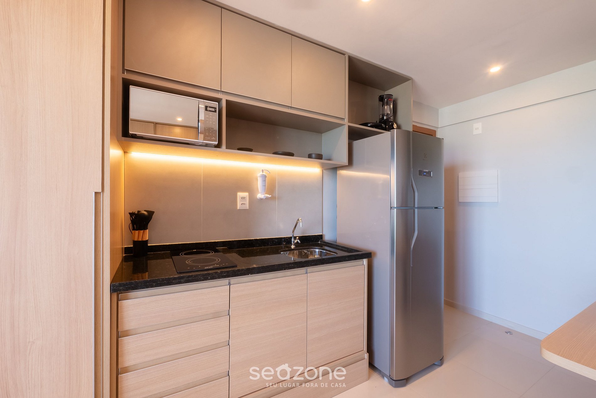 - Cozinha completa com geladeira, fogão cooktop (elétrico), cafeteira elétrica, sanduicheira, taças de vinho, panelas, louças e utensílios;